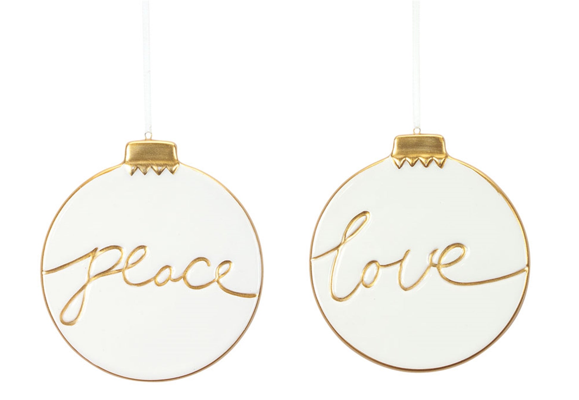 Adorn your Christmas Tree with this beautiful set of disc ornaments. Featuring two assorted designs, this set includes the sentiments "Love" and "Peace". The elegant white and gold design makes this set the perfect addition to your holiday tree decor. The quality ceramic composition is sure to last for seasons to come. The pieces can be used as gifts for friends to cherish, or you can display the set on your own Christmas tree and enjoy them for years to come.