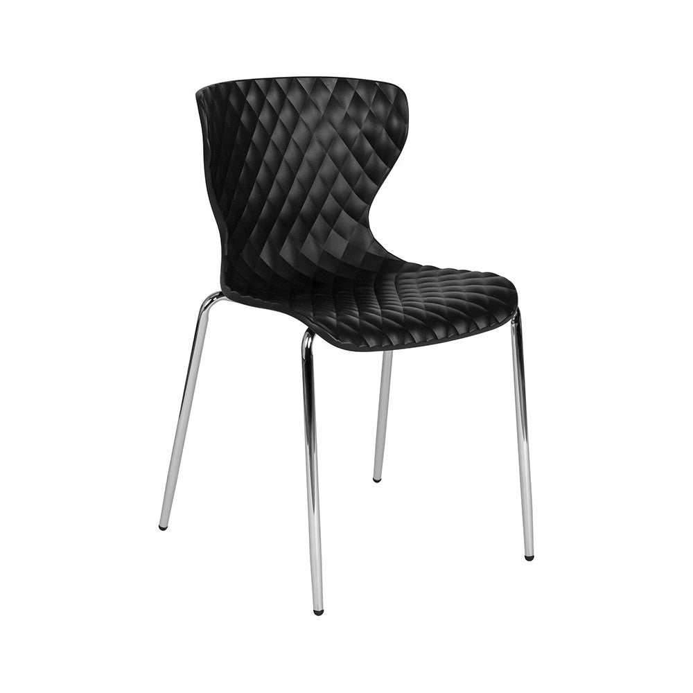 Bring excellent, reliable seating to any modern dining area, waiting room, or office with this black plastic stacking chair. Highlighted with a diamond quilted pattern, this chair offers plenty of style. It's perfect for use as an accent side chair in waiting areas, cafes, lounges, and casual restaurants. This chair boasts a waterfall seat to help reduce leg strain and provide superior comfort for your guests during their stay. No place is off limits as this quilted plastic stack chair will hold up in a classroom, conference room, restaurant dining room or around the home. [LF-7-07C-BLK-GG]