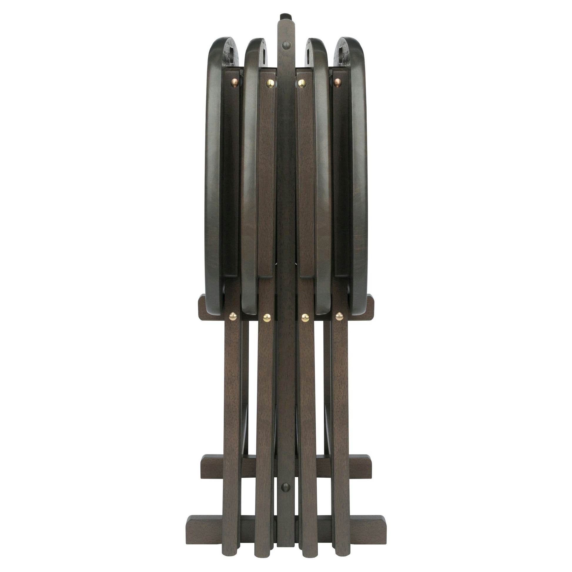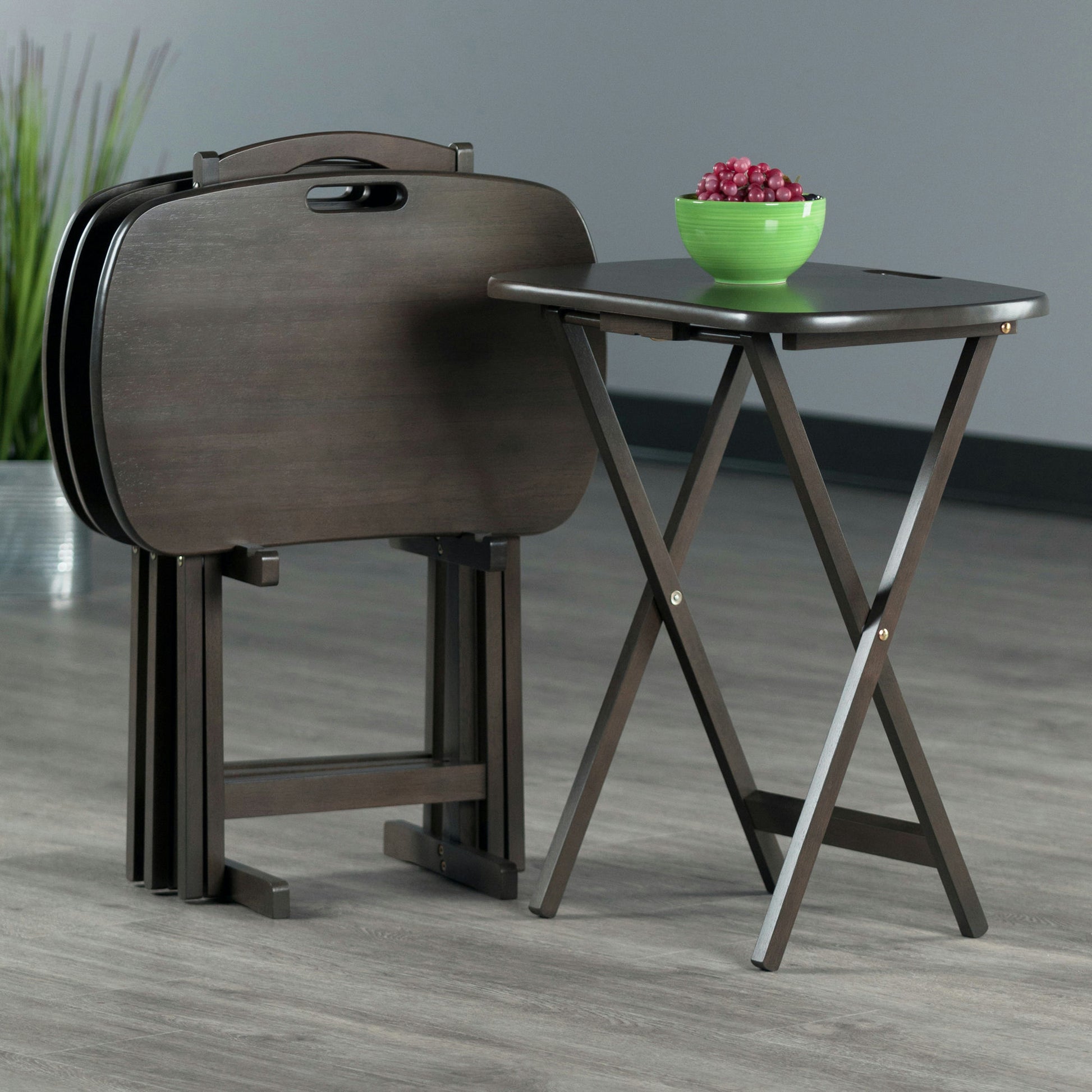 Enjoy a casual meal at home in style with the Lucca 5-Pc TV Table Set. The rounded oblong shape of the folding tables are handsomely designed with cut-out handles for easy portability. The tables stow neatly onto the notches in the stand to keep them securely in place when not in use. Made of Solid Wood in a contemporary Oyster Gray finish.