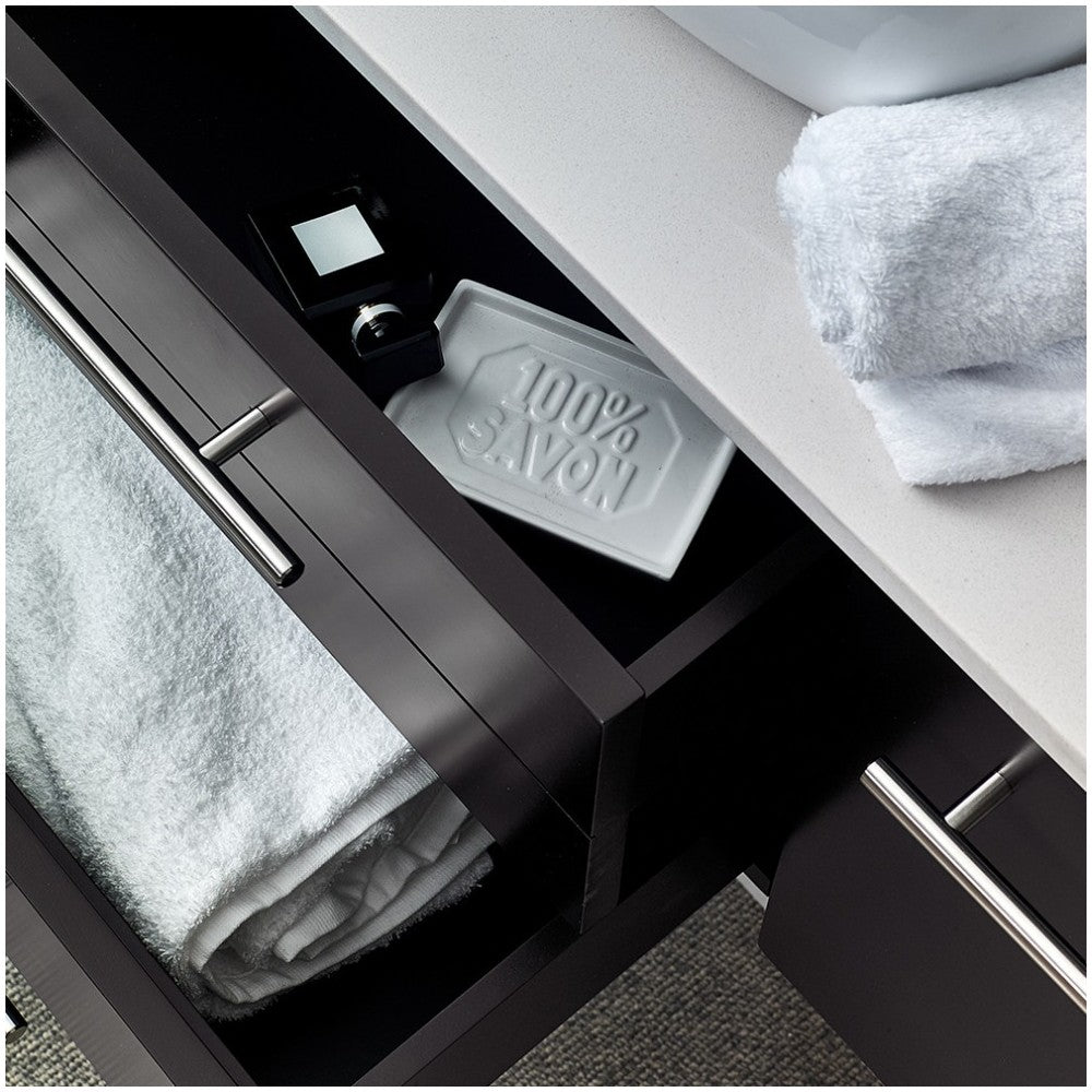 Classically simple with clean lines and a beautiful vessel sink, this Fresca Lucera Wall Hung Modern Bathroom Cabinet will bring out the best in any bathroom. Measuring 60" in width, this sophisticated cabinet has a well constructed solid wood frame with two roomy storage compartments for holding bathroom essentials and four spacious drawers with a decorative beveled drawer plate design. The doors and drawers are soft-closing and feature slim brushed metal handles. This modern cabinet has a chic painted Espresso finish. Gracing the top of the cabinet is a striking quartz stone countertop with a white vessel sink. The sink is equipped with an integrated overflow and single hole vessel faucet mount, ready for the faucet of your choice (sold separately). This cabinet includes installation hardware and is available in several sizes and finishes to meet your decorating needs