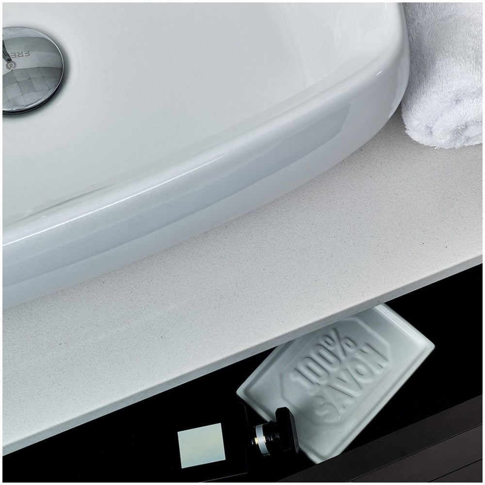 Classically simple with clean lines and two beautiful vessel sinks, this Fresca Lucera Wall Hung Modern Bathroom Cabinet will bring out the best in any bathroom. Measuring 72" in width, this sophisticated cabinet has a well constructed solid wood frame with two roomy storage compartments for holding bathroom essentials and four spacious drawers with a decorative beveled drawer plate design. The doors and drawers are soft-closing and feature slim brushed metal handles. This modern cabinet has a chic painted Espresso finish. Gracing the top of the cabinet is a striking quartz stone countertop with two white vessel sinks. Each sink is equipped with an integrated overflow and single hole vessel faucet mount, ready for the faucets of your choice (sold separately). This cabinet includes installation hardware and is available in several sizes and finishes to meet your decorating needs