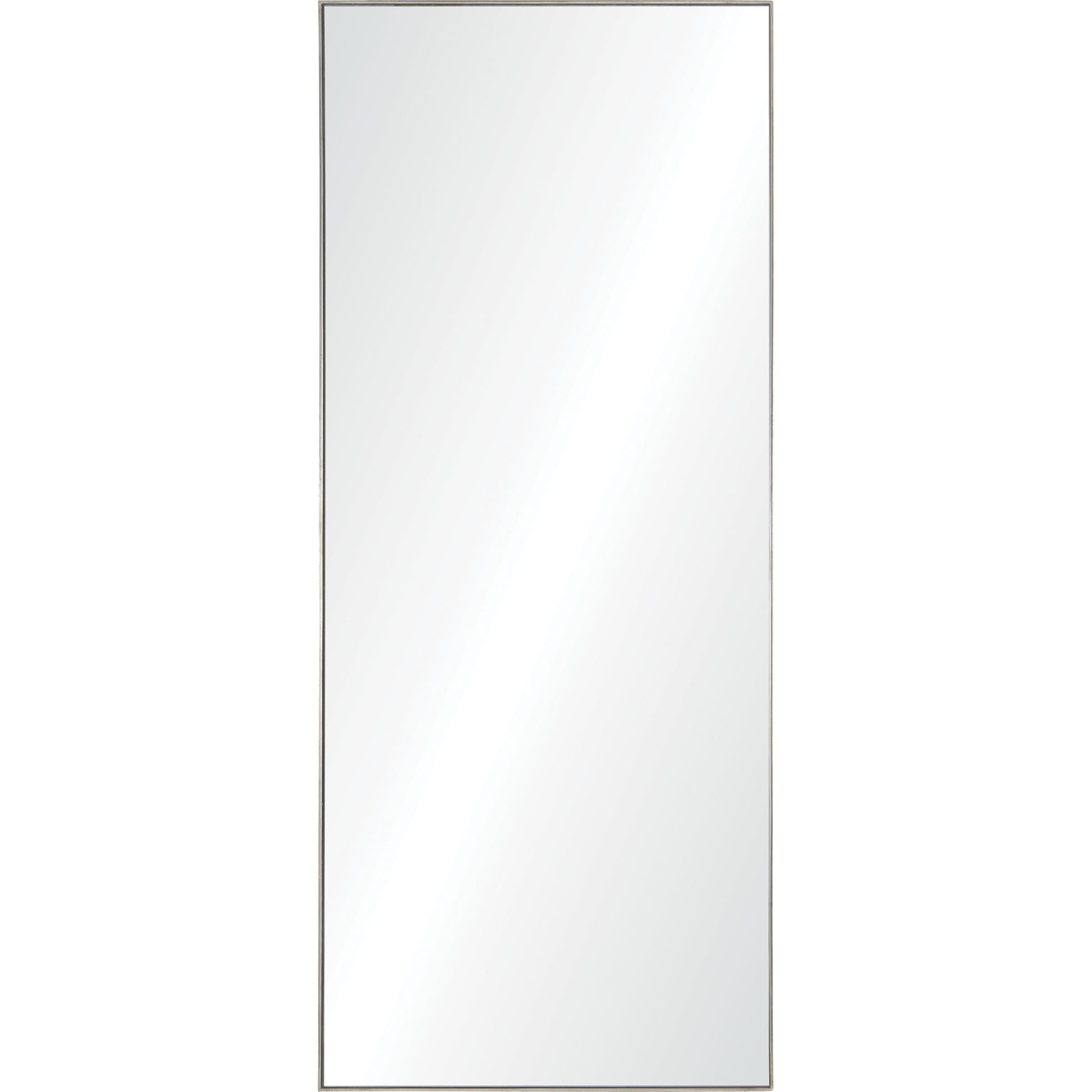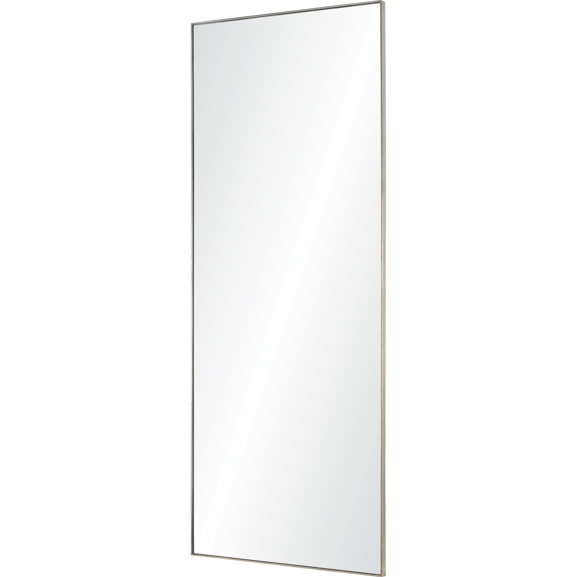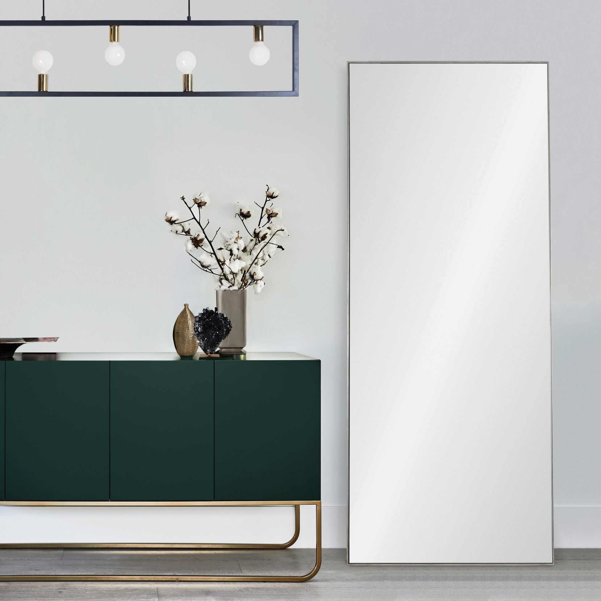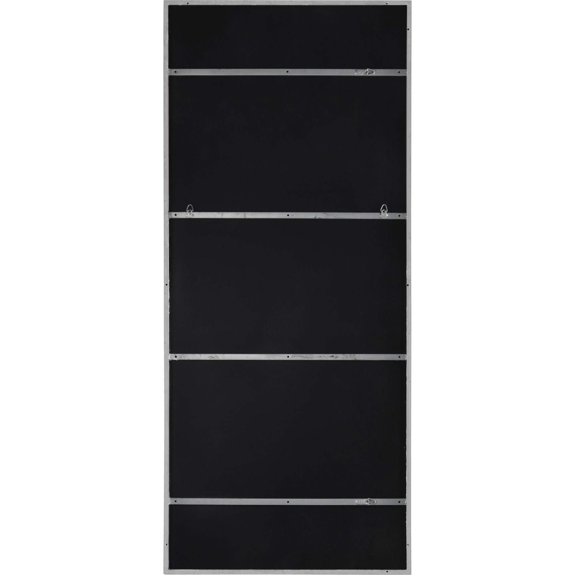 This floor length mirror captures the beauty of the interior in reflection. Featuring a striking silver finished iron border, it has a cool vibe that permeates the atmosphere. Set in the modern entryway, it provides the perfect opportunity to catch a glance before rushing out the door.