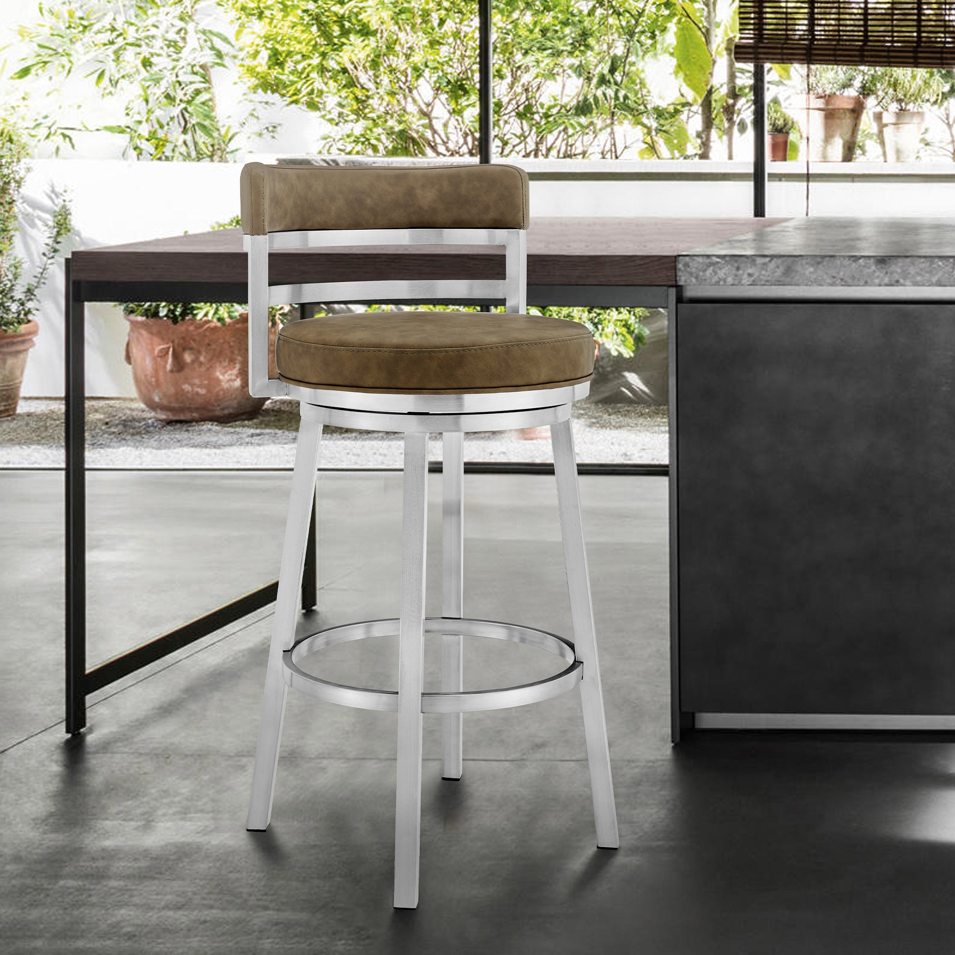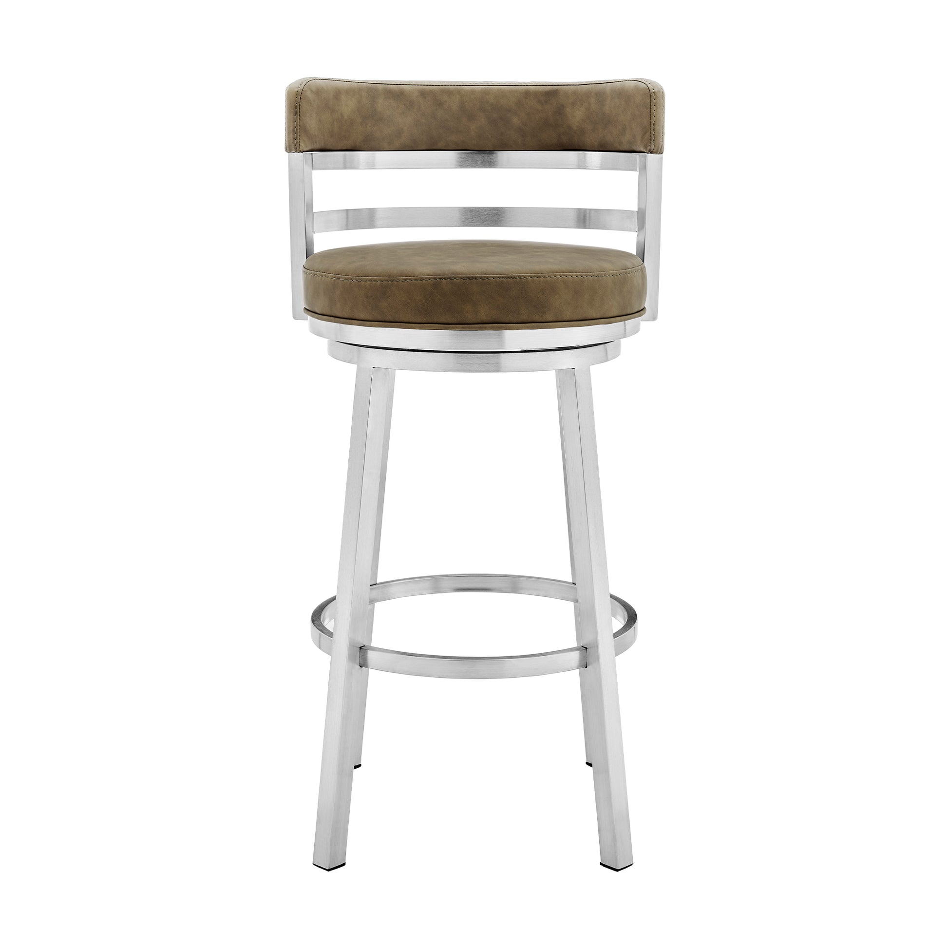 Style and function come together in harmony with the Madrid 26" Counter Height Swivel Green Faux Leather and Brushed Stainless Steel Bar Stool from Armen Living. Its armless design makes this the perfect addition to any home or apartment as it allows you to pull the kitchen stool as close as needed to your kitchen island, peninsula counter, or home bar. The Madrid frees you of any visual constriction with the 360-degree swivel motion, helping to keep you engaged with your friends at family at gatherings. The upholstered low back is rounded, providing the user with exceptional ergonomic support. The Madrid’s padded bar seat and back are constructed from high-density foam and wrapped in soft faux leather upholstery that will keep you comfortably seated for hours on end. The strong metal frame that’s further accented by the inclusion of a round footrest. The Madrid's legs are tipped with floor protectors, assuring that the bar stool will not slip on or scratch hardwood or tile floors, ensuring a durable bar or counter stool that will last for many years to come.
