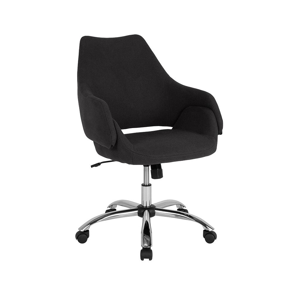 Explore new heights in this Upholstered Mid-Back Swivel Office Chair. Offering a fresh new look, this chair has a curvaceous frame with arms that curve with the frame. Chair easily swivels 360 degrees to get the maximum use of your workspace without strain. Raise and lower your seat height using the pneumatic seat height adjustment lever, conveniently located under the seat. A heavy duty chrome base with dual wheel casters makes it easy to roll across the floor. The slight open back finishes the look and charm of this chair. Browse for your next vacation or get those work tasks completed in this chair that is perfect for the office or home office. [CH-177280-BLK-F-GG]