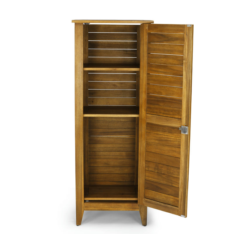 This solid acacia cabinet is highlighted by a golden teak finish and sealed with linseed oil that brings out the natural beauty of the wood. Three adjustable shelves let you customize the space to your needs.