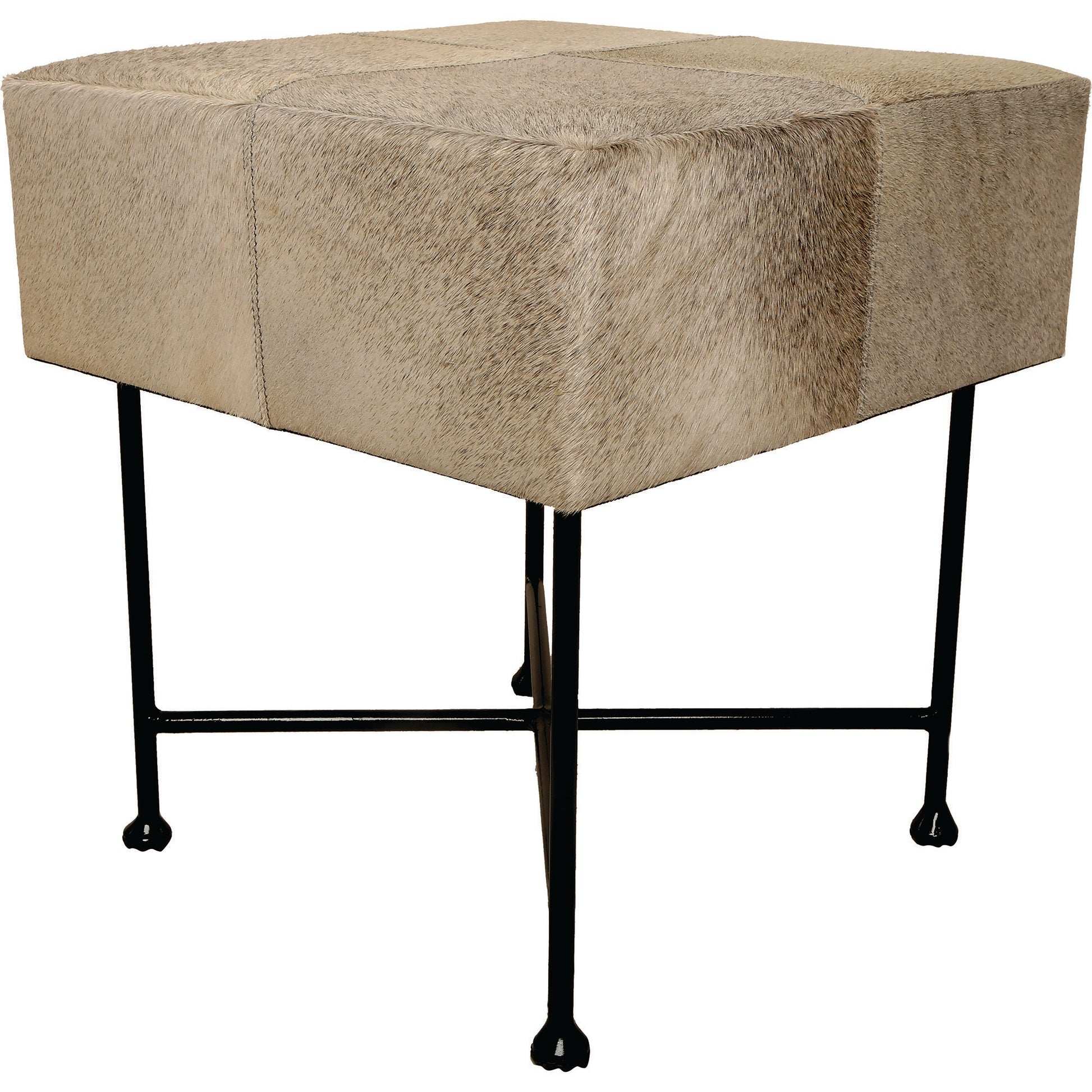 This traditional stool artfully blends downhome style with downtown design details. A classic trestle base serves as a sturdy foundation for the course texture of a hair-on-hide leather cushion. The combination of rustic gray iron and animal hair makes this upholstered stool an unexpected accent furniture piece in farmhouse-inspired spaces.