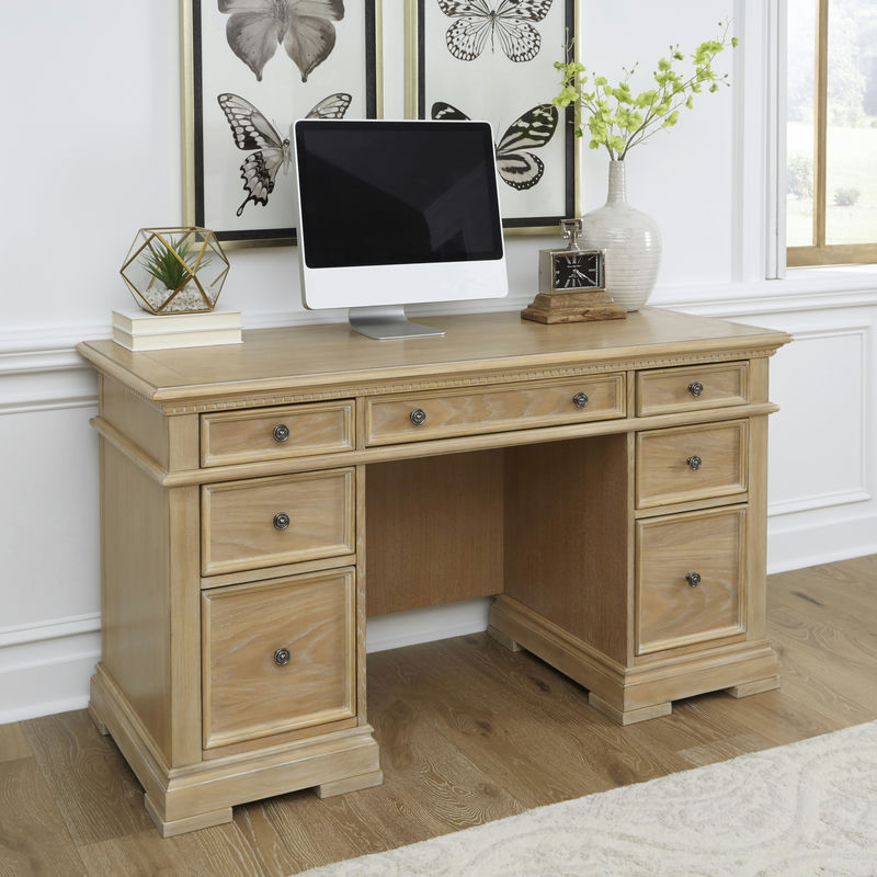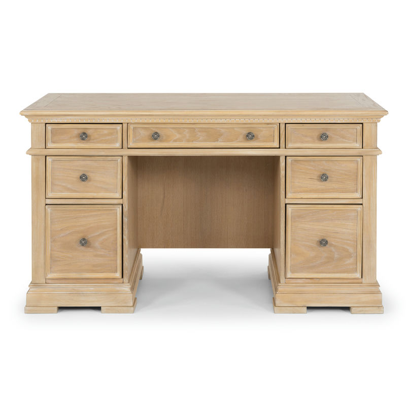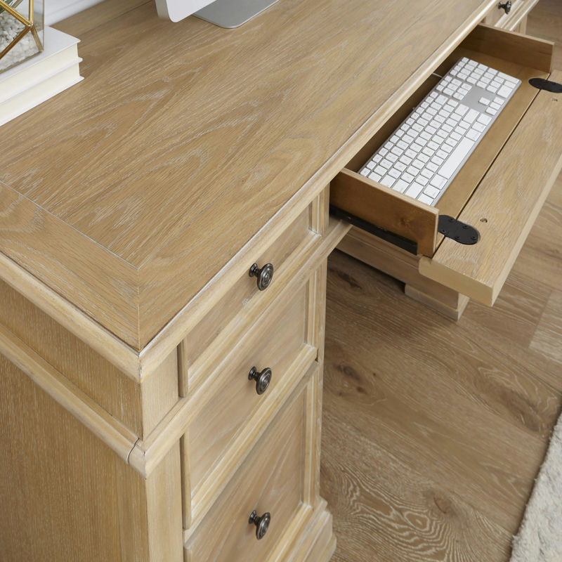 Traditional design with a hint of contemporary. The Manor House Pedestal Desk by homestyles is crafted from wire-brushed hardwood solids and Off-White oak veneers over engineered woods with an aged waxed, Off-White oak finish. The desk features a raised base with eight block feet and is finished on all for sides. There is a center modesty panel and two file drawers on each lower side with full extension glides, allowing for letter- or legal-sized files. The desk features four utility drawers with a single fold-down lap drawer front for easy keyboard access. Drawer backs have a cut-out for electrical cord access. Finish and measurements may vary slightly. Assembly required. Arrives at your door by parcel delivery service.