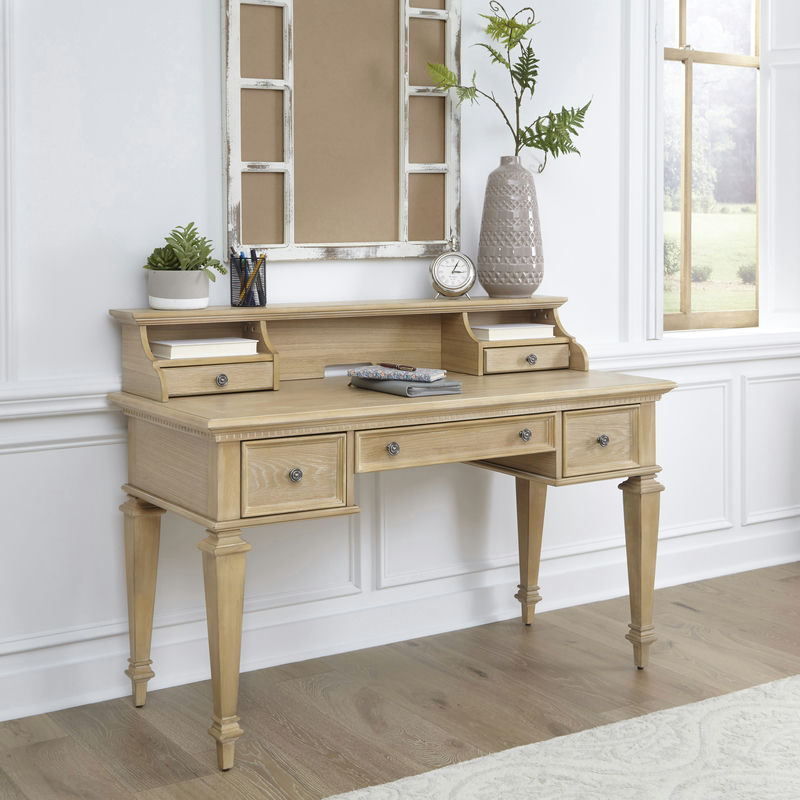Traditional design with a hint of contemporary. The Manor House Desk with Hutch by homestyles is crafted from wire-brushed hardwood solids and white oak veneers over engineered woods with an aged waxed, white oak finish. The desk features carved, turned legs. There's a piano molding under the top, adding to the traditional design. There are three drawers with an outer-edge, picture frame molding and antique nickel drawer pulls. The hutch features uniquely shaped side panels with an upper storage shelf, two drawers, and pigeonhole storage areas. The back panel has a cut-out for wire management. Note finish and measurements may vary slightly. Assembly required. Arrives at your door by parcel delivery service. Measures: 38.5"H x 54"W x 24"D.