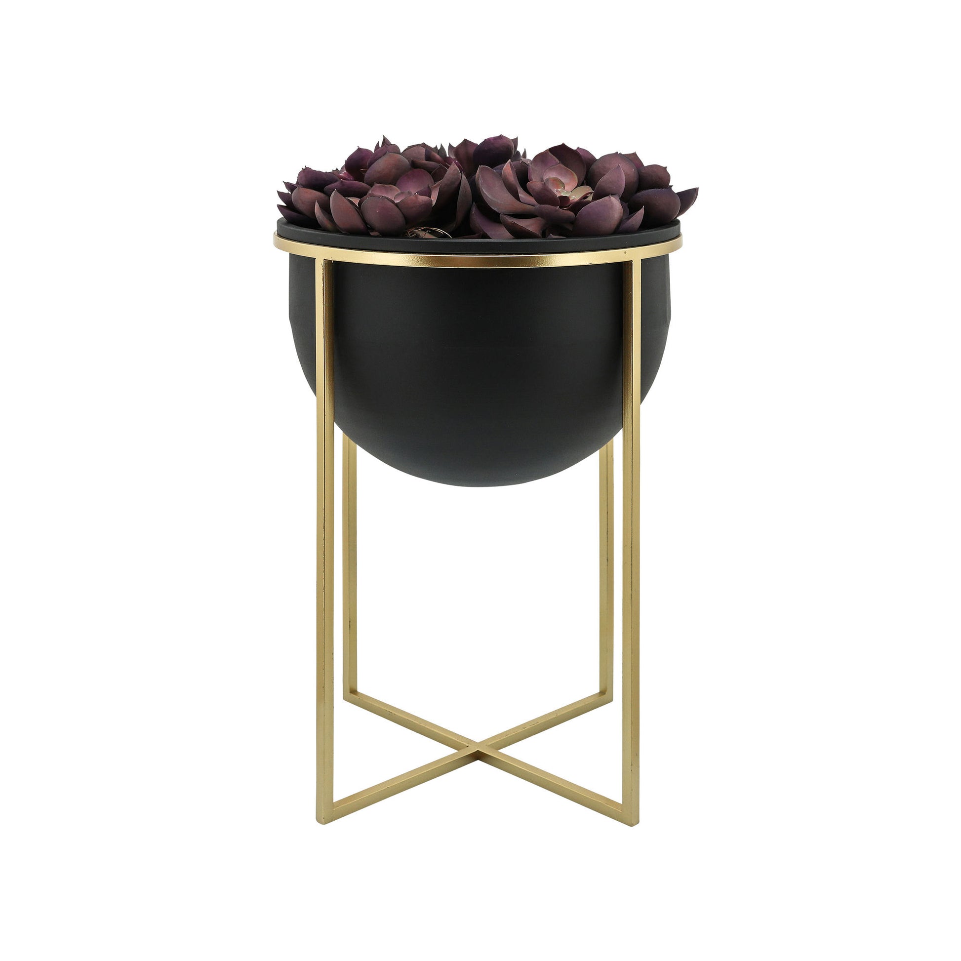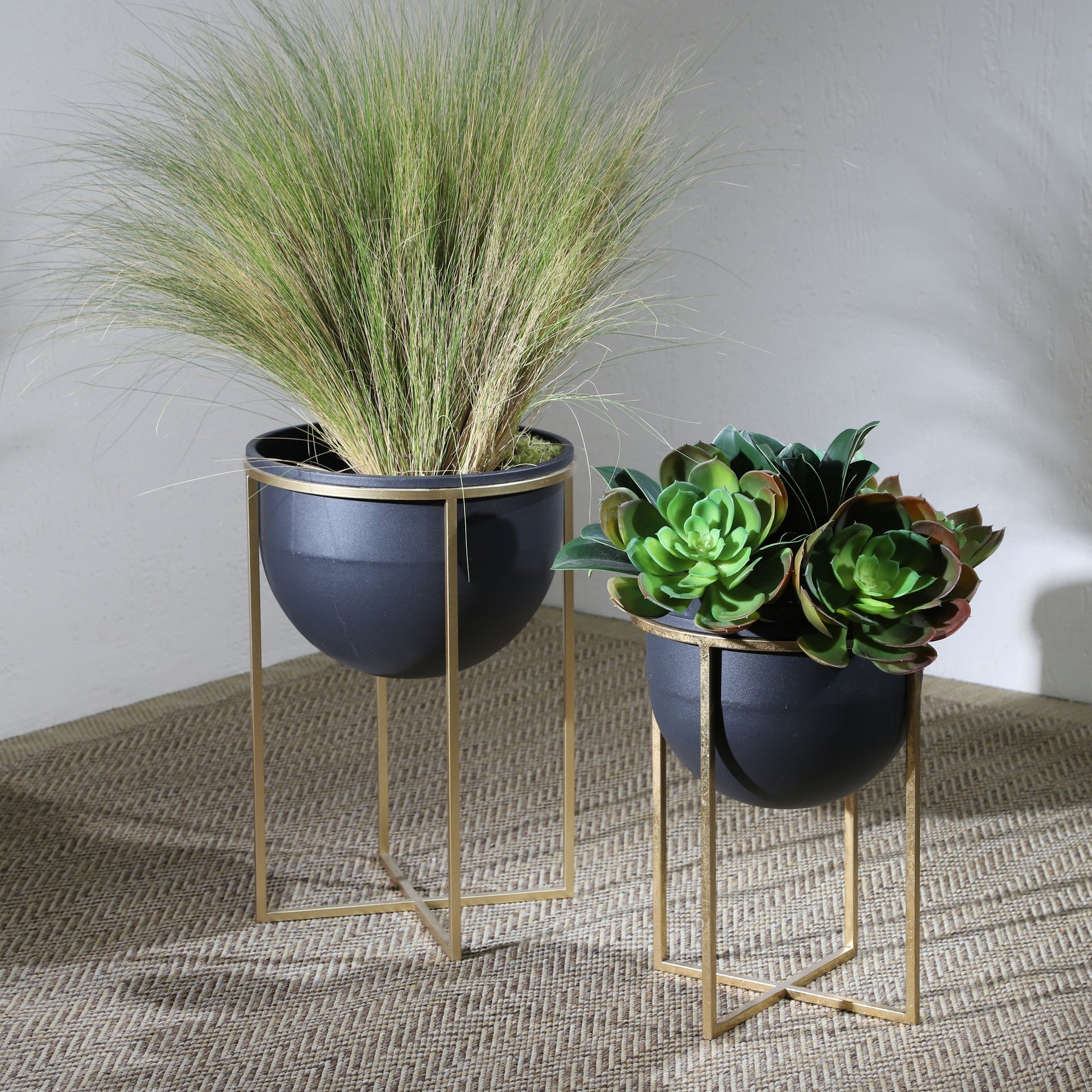 Metal S/2 11/12" Planters W/ Stand, Blk/gold