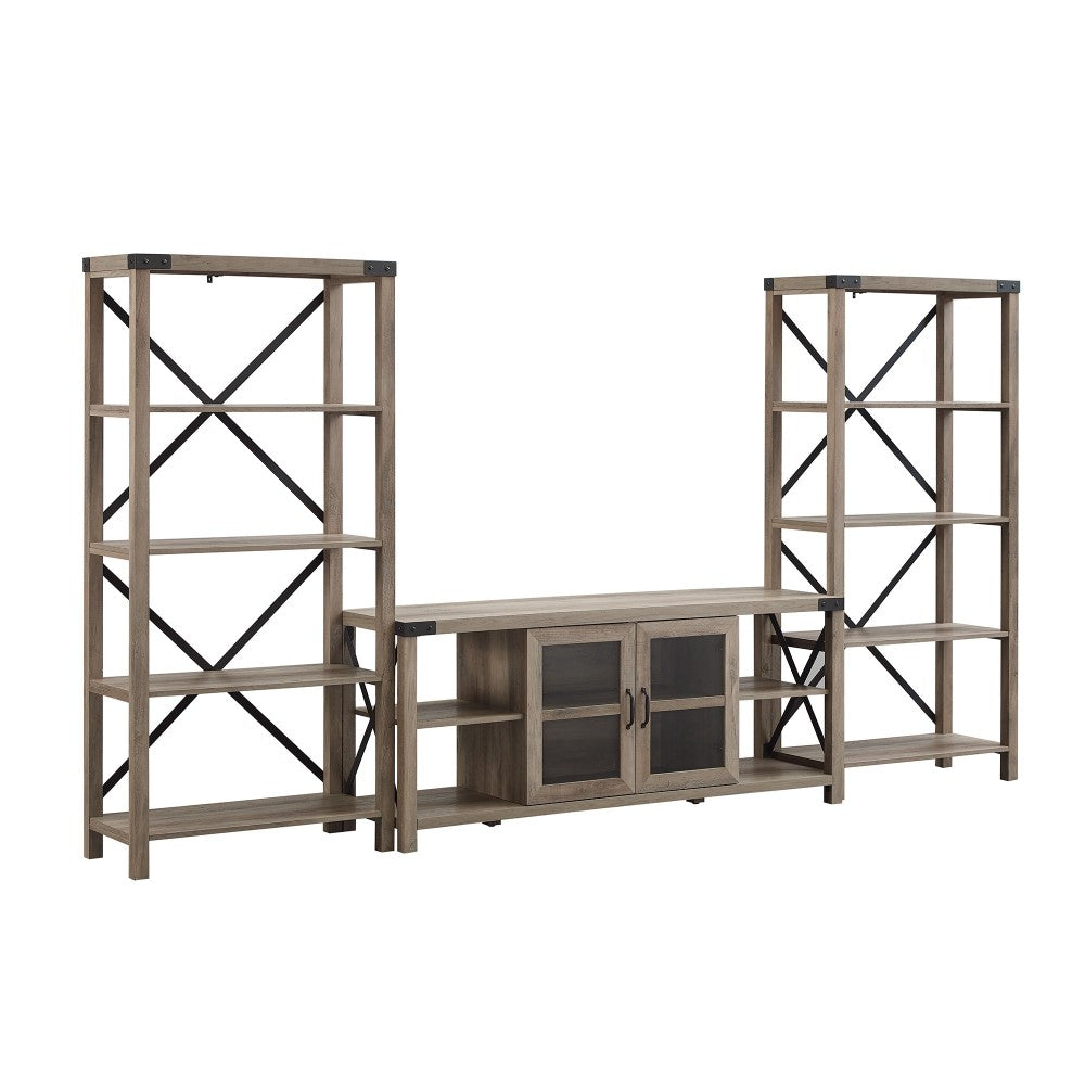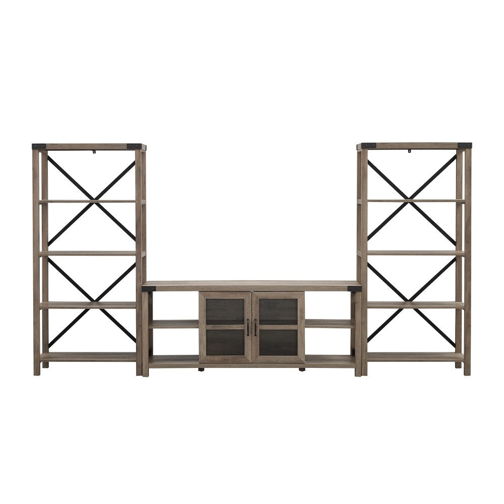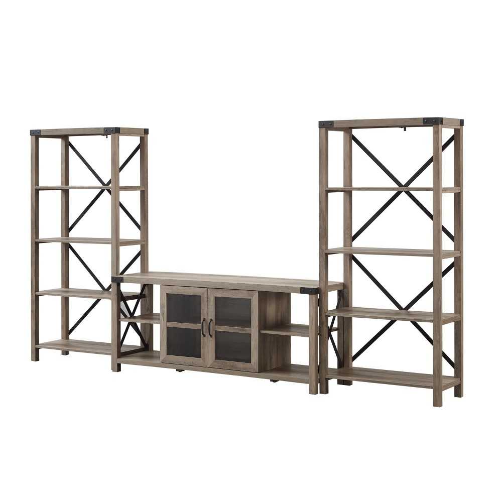 Don't put any limits on your entertainment options with this modern, farmhouse inspired wall unit made of two bookshelves and one TV stand. The tall, freestanding bookshelves insert country charm into your living room with features like rustic corner accents across the top and metal X bars across the back. These vertical shelves can serve as media towers or display space. Accommodating TVs up to 68 inches, this media console boasts similar accents as the shelves, as well as cord management, two tempered glass doors with soft-close hinges, and an array of storage options.