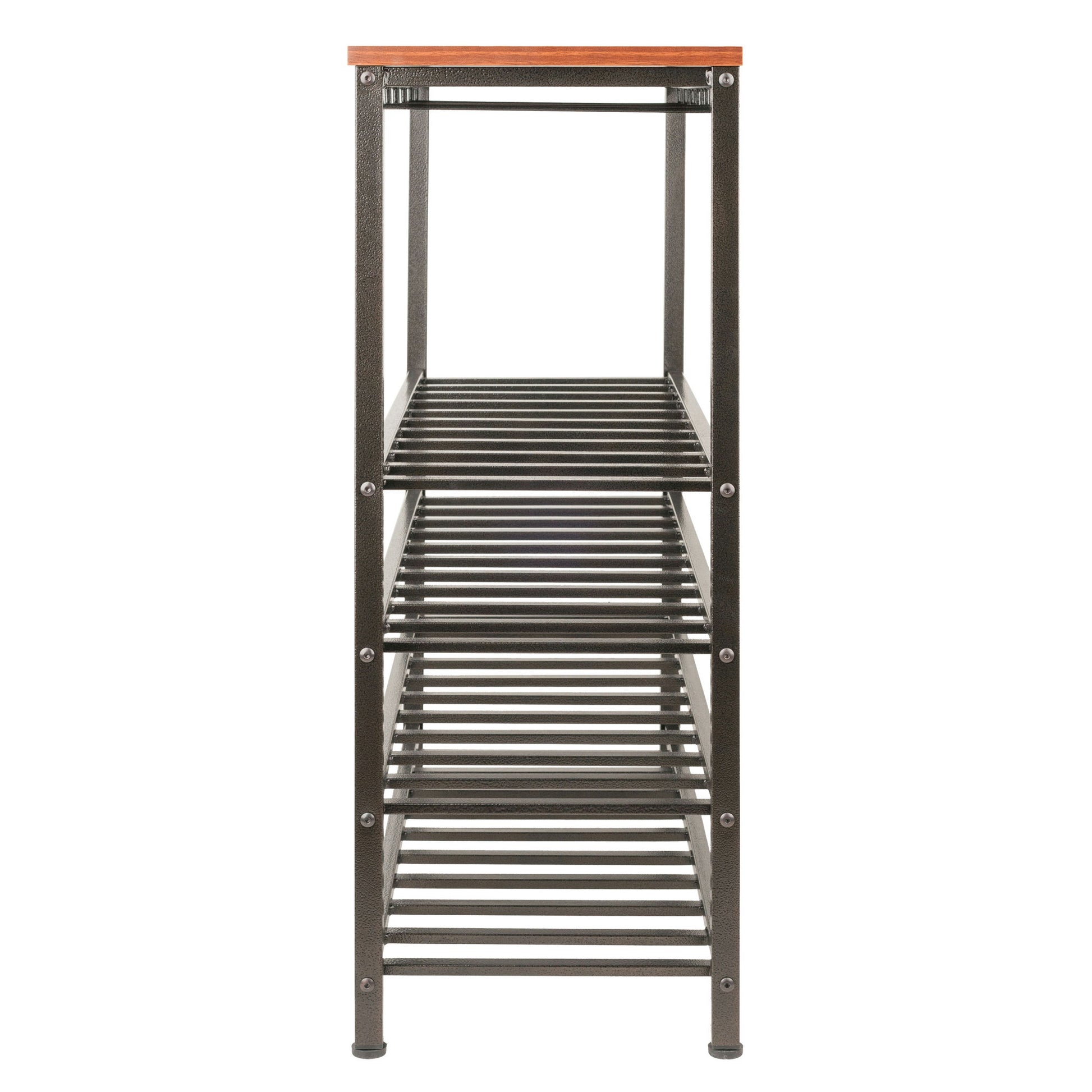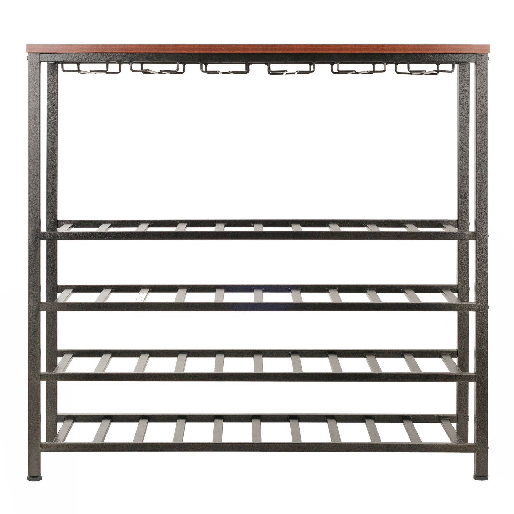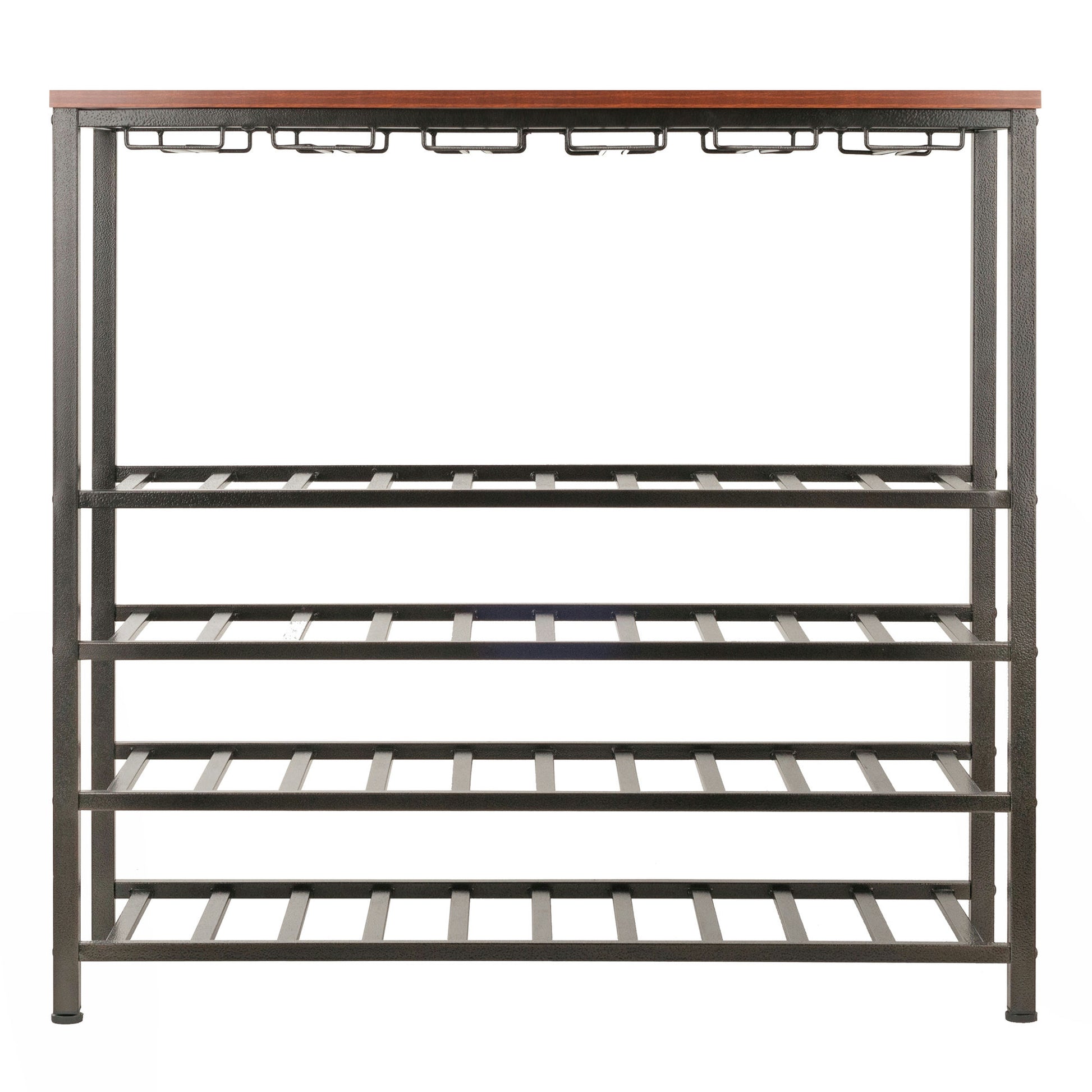 The Michelle Wine Rack with Glass Hanger is perfectly sized for the true wine connoisseur. It has the capacity to store 40 bottles of wine and up to 24 standard sized wine glasses. Its simple and contemporary design will enhance any decor. Show off your wine collection wherever you entertain, or use the Michelle Rack to start your own wine cellar. Made of Antique Bronze textured metal paired with a Walnut finished wood top. The overall size of the wine rack is 38"W x 14"D x 26.4"H.