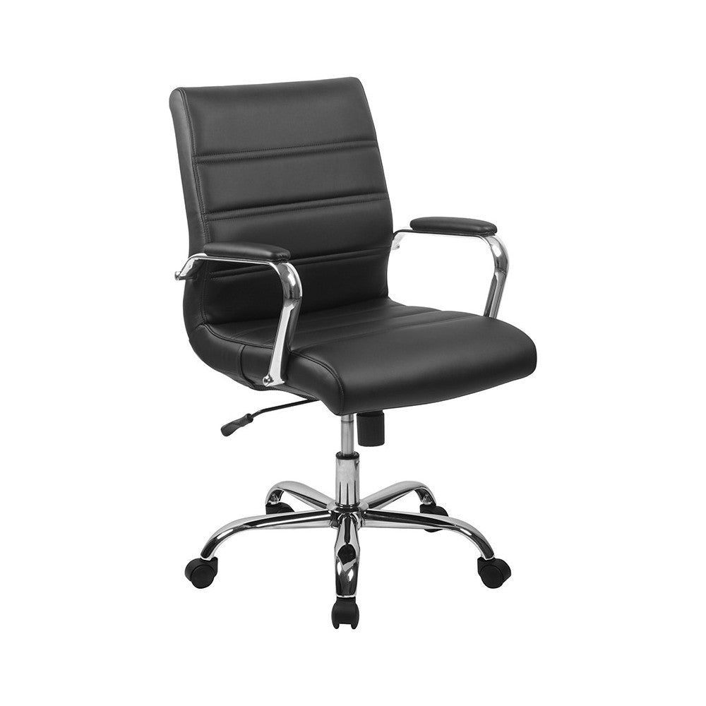 Toss out that old and boring office chair that you've had for years, because it's time for an upgrade with this sleek mid-back LeatherSoft office chair. No longer used in just offices, you are seeing office chairs used in nail salons, car shops, and stores to help busy workers achieve maximum comfort while performing their work duties. Upholstered in soft and durable LeatherSoft upholstery and paired with chrome finishing help construct this modern office chair. Designed with your comfort in mind, this ergonomic desk chair features ample padding to get you through an 8-hour workday or be your seating of choice to furnish your conference room. With its adjustable features you can lean back while you take a quick phone call or lock in an upright position when it's time to focus. The knob located underneath the seat adjusts the force needed to recline. Improve the look at your desk or work area with this stylish Mid-Back Black LeatherSoft Office Chair with Chrome Base that is highlighted by attractive horizontal line stitching. A waterfall front edge seat reduces pressure off your legs while the armrest pads relieve the pressure off your necks and help round out the look and comfort of this chair. [GO-2286M-BK-GG]