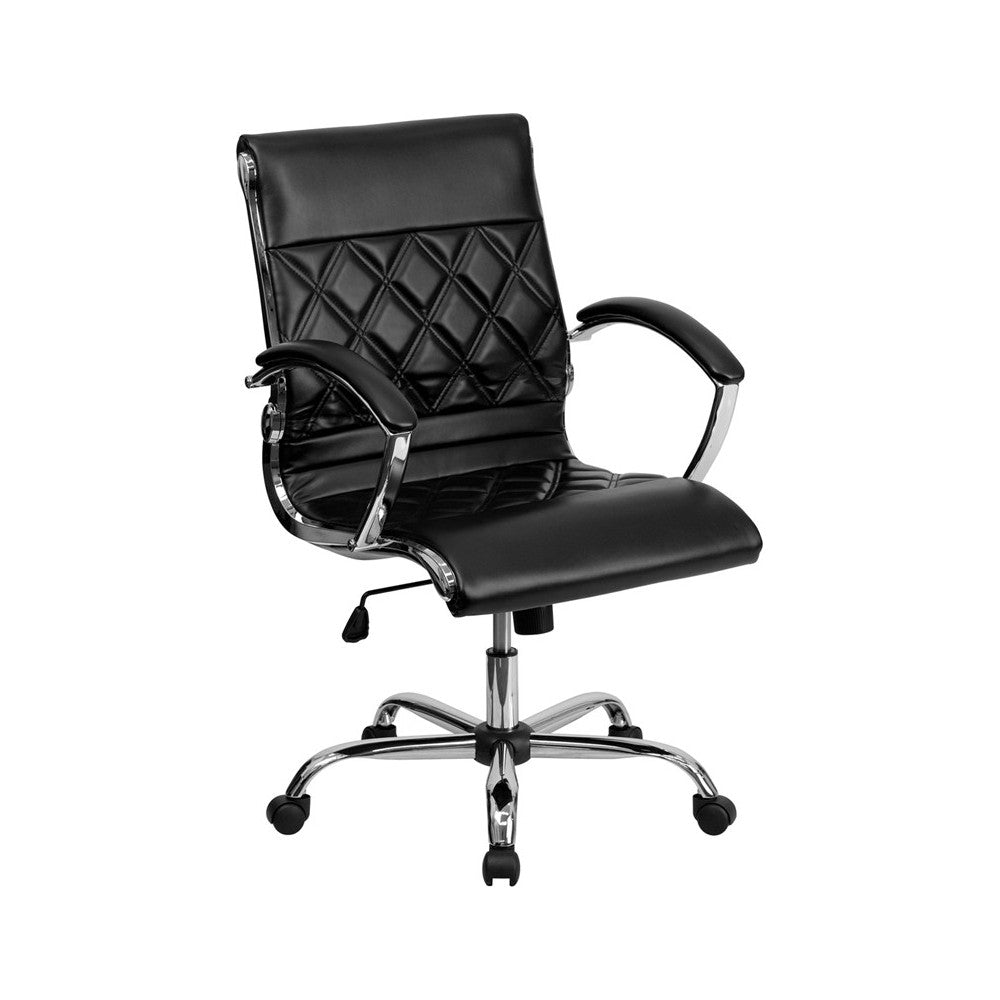 This elegantly designed chair features durable LeatherSoft upholstery with an attractive stitch design and a chrome frame that leads in attractiveness. A mid-back office chair offers support to the mid-to-upper back region. The comfort molded seat has built-in lumbar support. The tilt lock mechanism offers a comfortable rocking/reclining motion. The free rein motion is great for taking a quick break from typing to answer phone calls and relax. The waterfall front seat edge removes pressure from the lower legs and improves circulation. Chair easily swivels 360 degrees to get the maximum use of your workspace without strain. The pneumatic adjustment lever will allow you to easily adjust the seat to your desired height. If you're looking for a modern office chair that provides a sleek look, then this chair will deliver. [GO-1297M-MID-BK-GG]