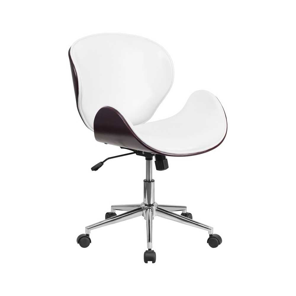 This office chair features a beautiful mahogany bentwood frame with glossy white LeatherSoft upholstery. LeatherSoft is leather and polyurethane for added softness and durability. A mid-back office chair offers support to the mid-to-upper back region. The tilt lock mechanism rocks/tilts the chair and locks in an upright position while the tilt tension adjustment knob adjusts the chair's backward tilt resistance. The contoured backrest provides firm back support. Chair easily swivels 360 degrees to get the maximum use of your workspace without strain. The pneumatic adjustment lever will allow you to easily adjust the seat to your desired height. This chair is sure to make an impression and become the focal point in your office or home office. [SD-SDM-2240-5-MAH-WH-GG]