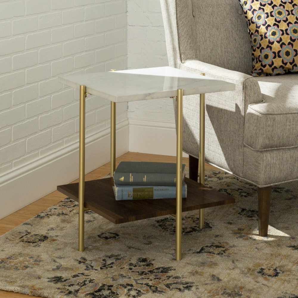 Mid Century Modern Square Side Table - Faux White Marble/Dark Walnut/Gold