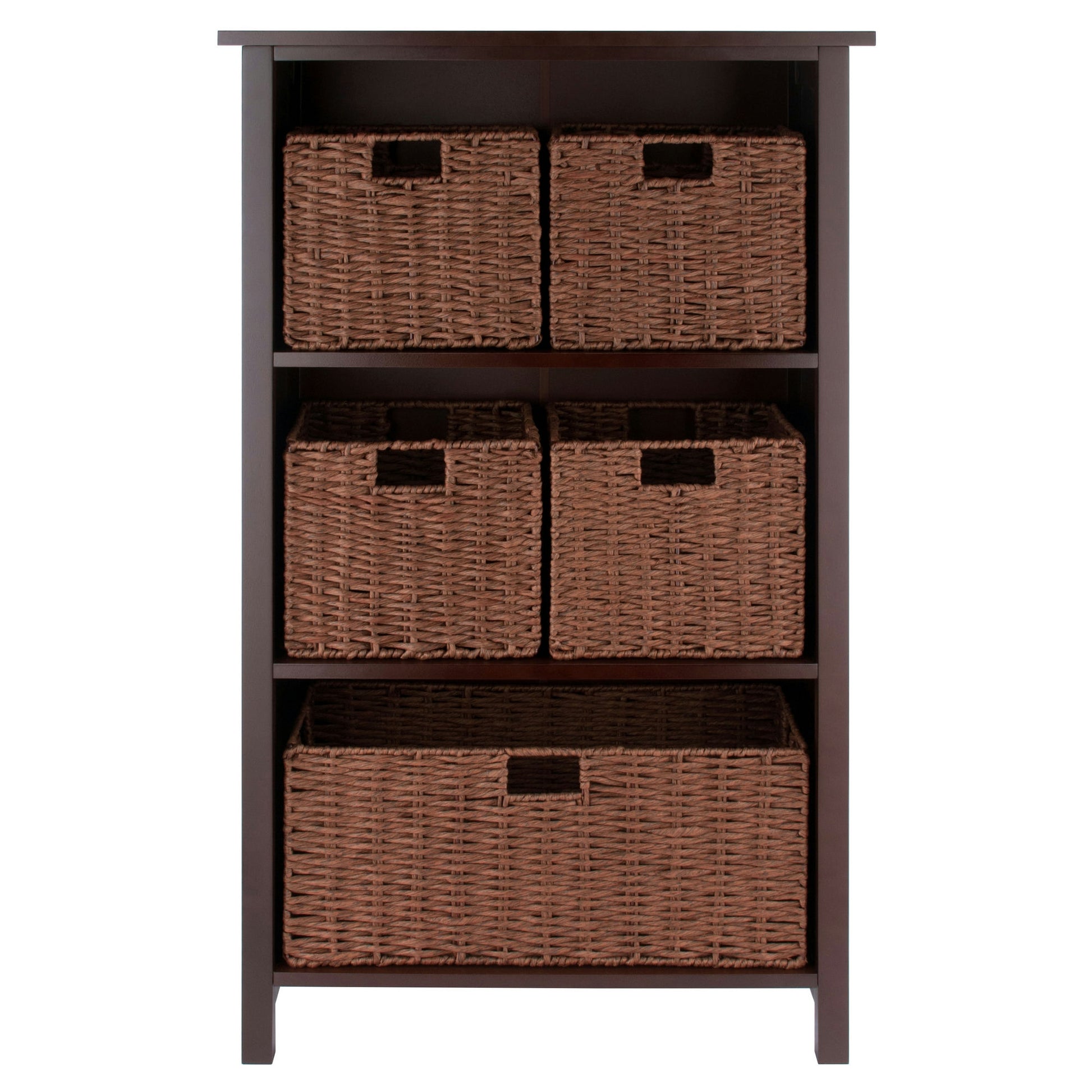 Offering loads of clutter-free storage with a touch of farmhouse styling, the Milan 6-Piece Storage Shelf with 5 baskets will keep any room neat and organized. The 4 small and 1 large woven rope baskets fold for compact storage when not in use and have cutout handles to make carrying easy. Finished in a rich Walnut.