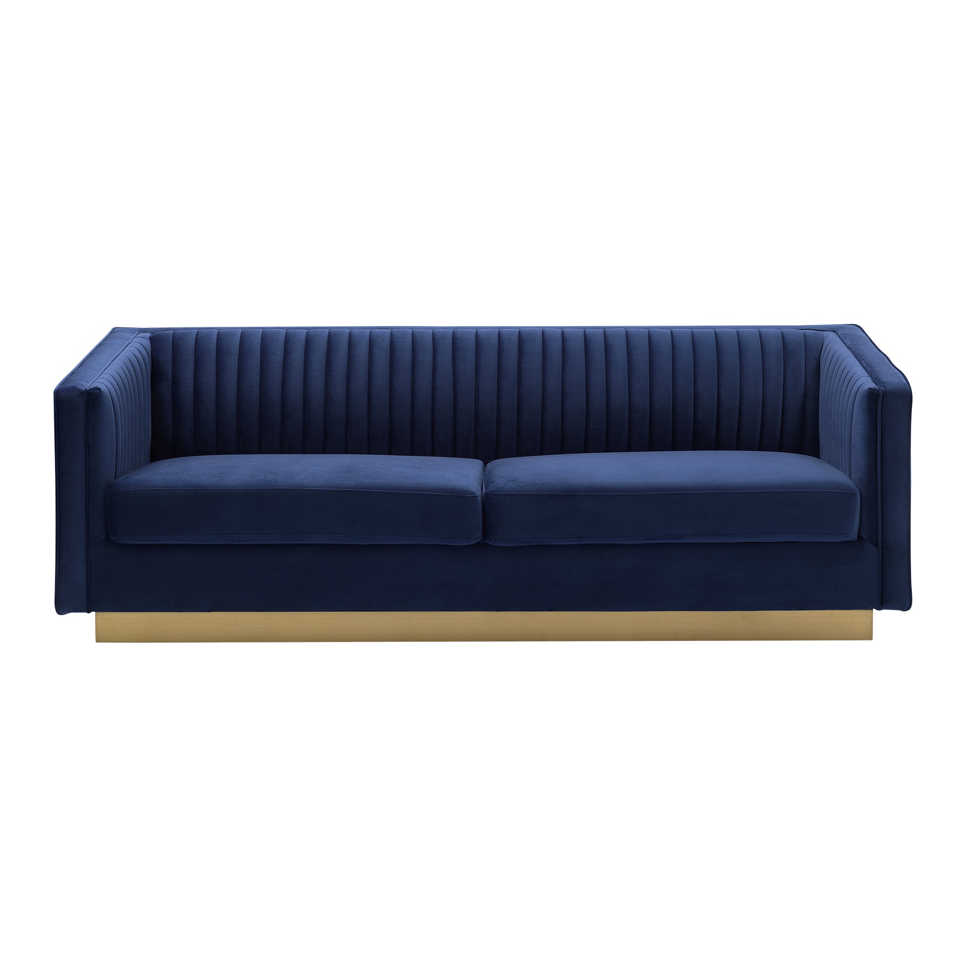 Make a chic statement in your living room with The Armen Living Miranda Velvet Sofa. Featuring a sleek silhouette, the Miranda is upholstered in a rich velvet fabric that feels exceptionally soft to the touch. Channel tufting highlights the stunning sheen in the velvet, while the striking antique gold finished metal base anchors the glamorous look of this sofa.