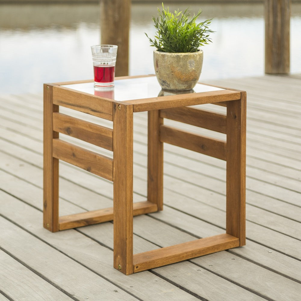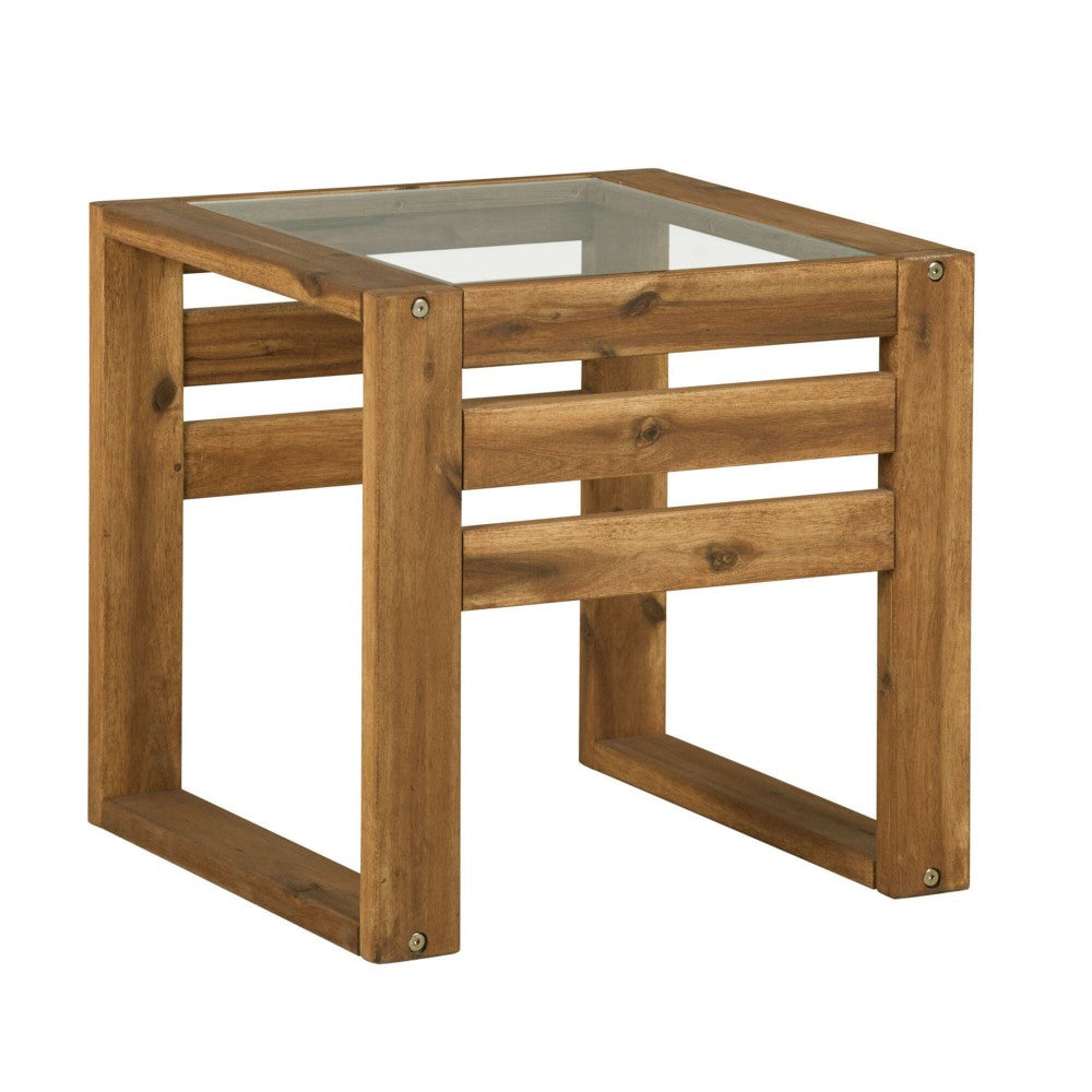 With the perfect blend of acacia wood and glass, this outdoor open side end table is both durable and stylish. Featuring side slats for a modern and contemporary twist to a classic and traditional inspired frame. Use it as a finishing touch to your outdoor assortment on your patio and enjoy sipping drinks with friends and family.