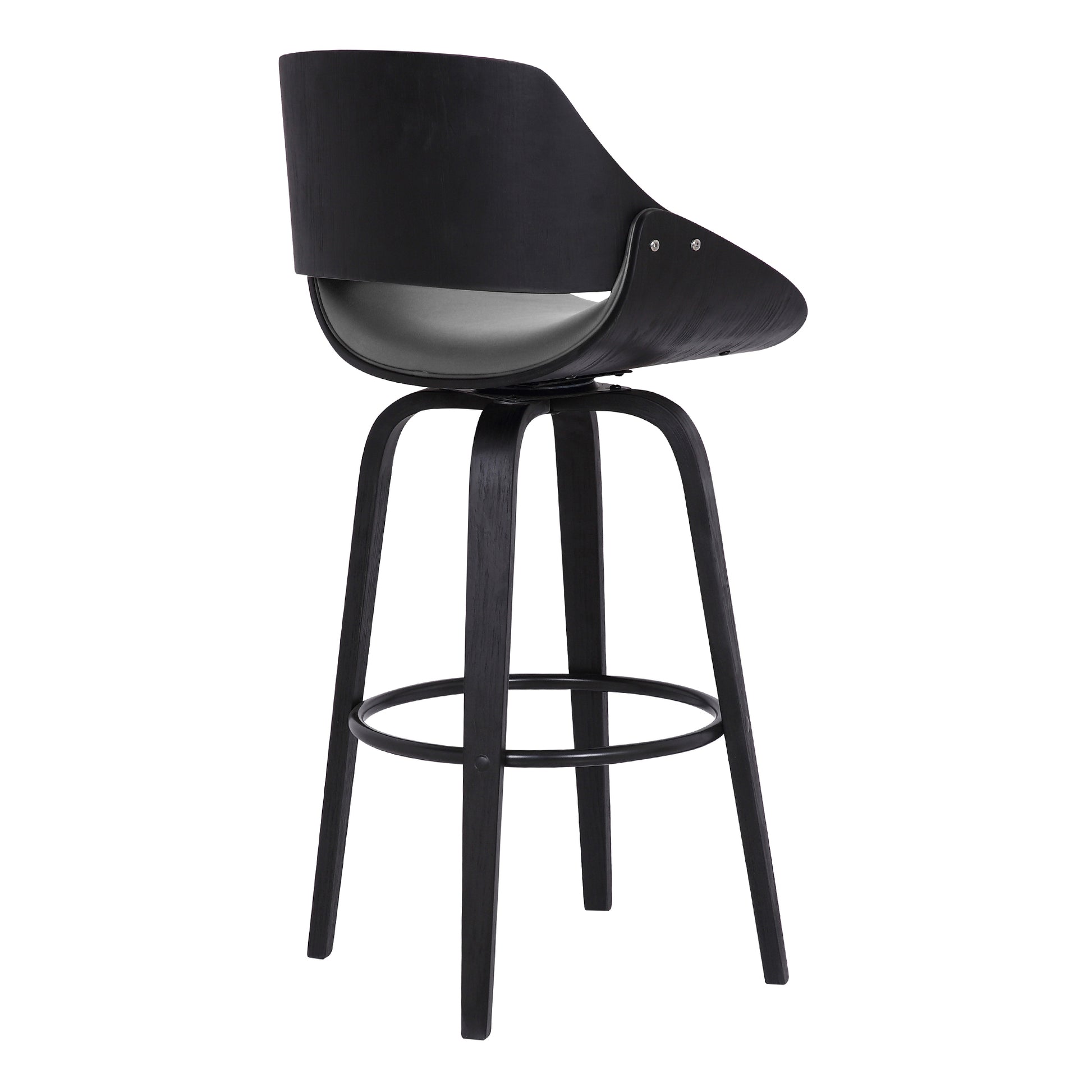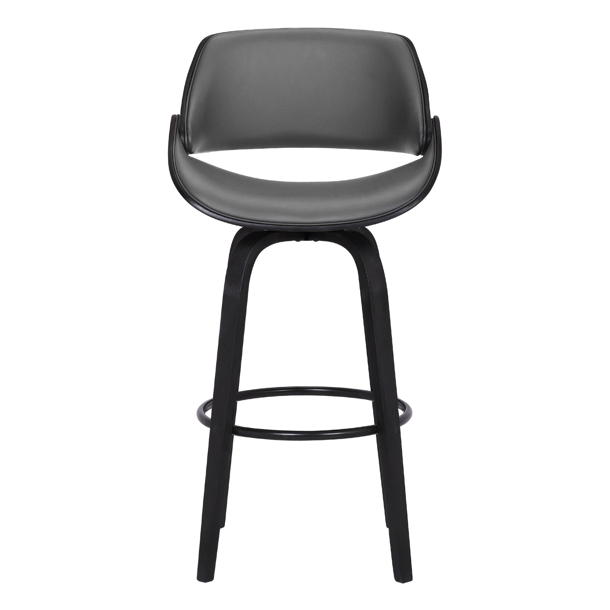 The Mona 30" Bar Height Swivel Grey Faux Leather and Black Wood Bar Stool from Armen Living is the ideal addition to any home or apartment. The retro silhouette exudes timeless appeal that would easily fit into any home regardless of the existing design theme. The Mona kitchen stool features a beautiful wood frame and seat back that wrap around a luxurious high-density foam cushioned back and seat that is further complimented by the inclusion of a convenient metal ring footrest. Upholstered in soft faux leather upholstery, the Mona provides a full mobility with a 360-degree swivel function that enables you to engage with your guests regardless of their place in the room! Available in a 26” or 30” seat height, the Mona Bar or Counter Stool can easily incorporate into your kitchen or home bar area.