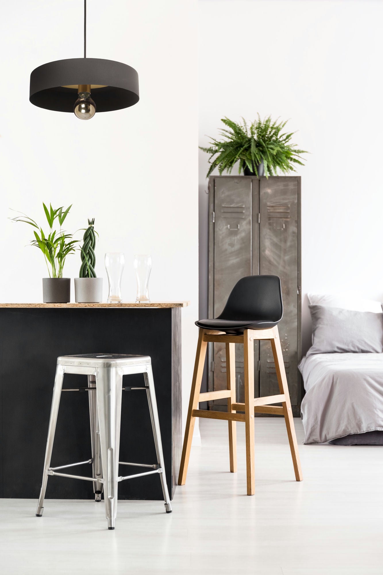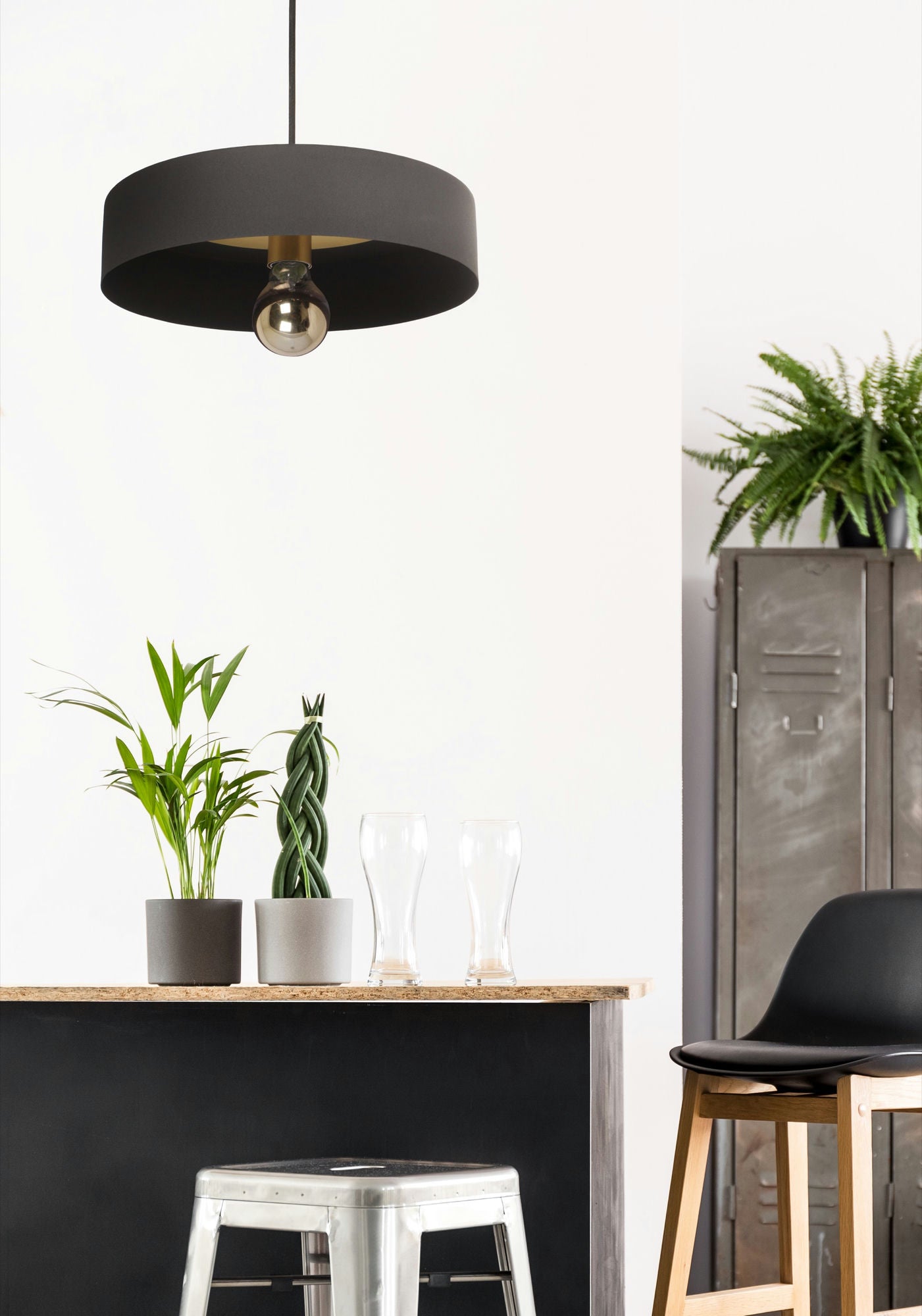 In the quest for warmth in light and design this ceiling fixture is the answer. While dark and sophisticated with a black powder coated iron structure, the matte brass interior becomes the stand-out element when lit.