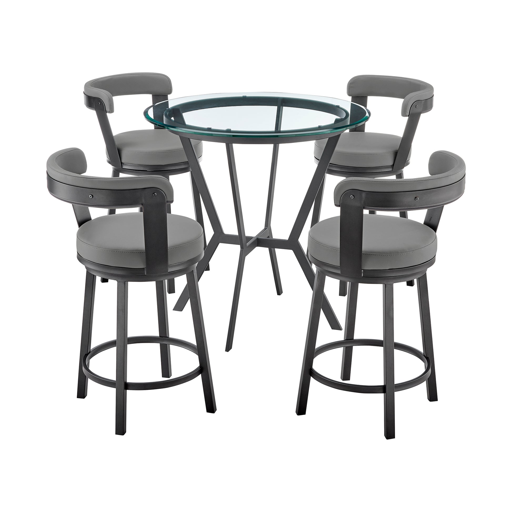 Take dining or entertaining to the next level with the Naomi and Bryant counter height dining set from Armen Living. The Naomi is a contemporary bar table that adds a touch of pure sophistication to a kitchen, bar, or lounge area, or even a breakfast nook. It features a strong and striking black metal x-shaped base, giving it a sleek and stunning visual. The Bryant metal bar stools were crafted with a durable frame; easy to take care of and clean, this stool will give you excellent use for years to come. The faux leather upholstery is luxuriously wrapped around the high-density foam cushions of this barstool, adding yet another comfortable feature. The Bryant also features a convenient metal footrest, as well as a 360-degree swivel mechanism that maximizes mobility for you and your guests. This 5-piece set includes 4 stools and 1 round table. The Naomi and Bryant dining set has a black metal finish, glass tabletop, and grey faux leather upholstery. The Bryant stools have a 26-inch seat height and can support up to 250lbs per seat.