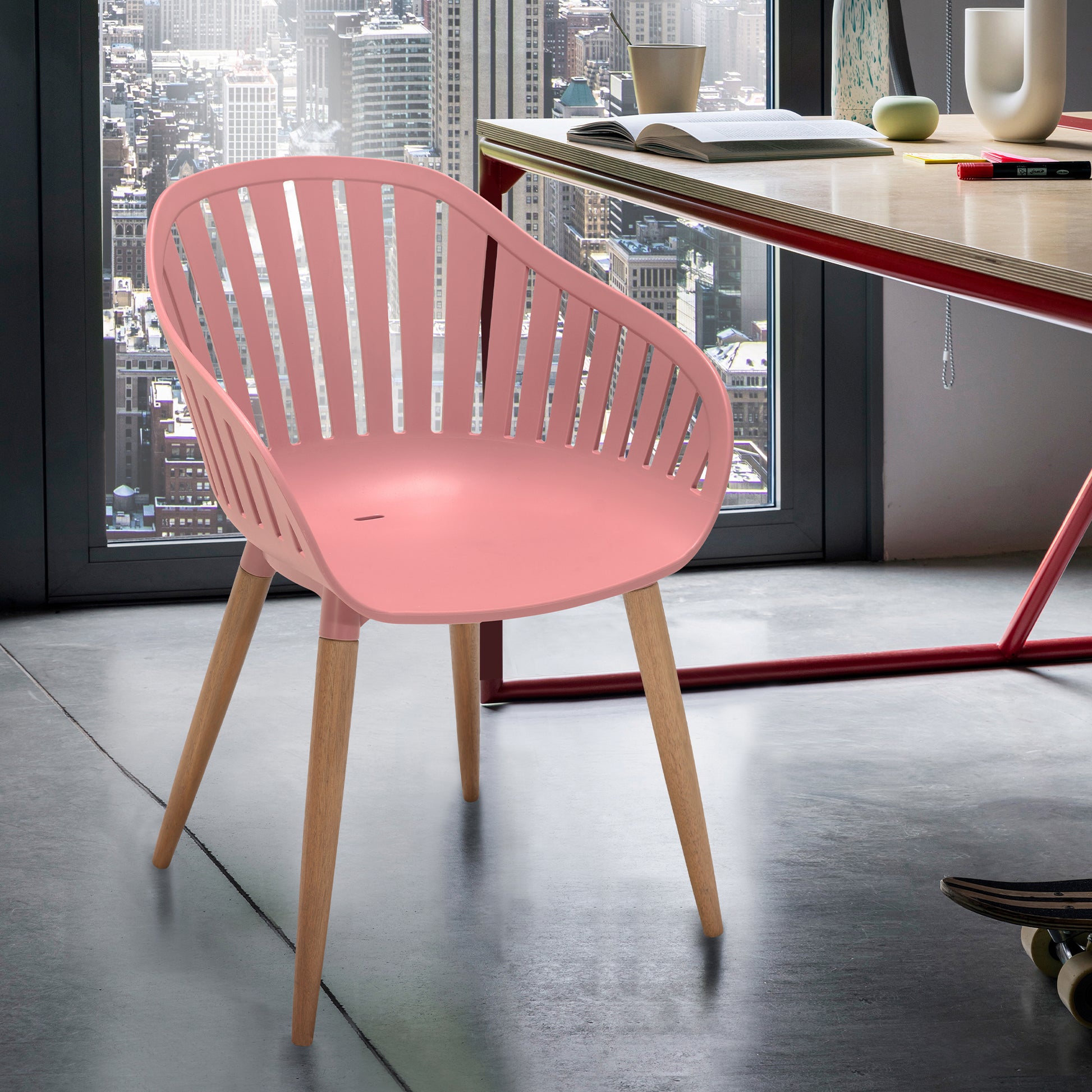 The Armen Living Nassau Outdoor Arm Dining Chairs - set of 2 are the perfect match for every patio and will give your backyard the class and elegance for outdoor dining. The chairs are made from plastic. The eucalyptus legs comfortably support the midcentury modern style plastic base. This set combines luxury, beauty, comfort, and an affordable price. This contemporary set is primarily designed for outdoor purposes but can also be used indoors giving your home a modern touch. Durable and well-designed construction is key components of this great patio set. The Armen Living Nassau Outdoor Arm Dining Chairs - set of 2 are available in your choice of Sand, Honey, Peony or Sage with eucalyptus legs.