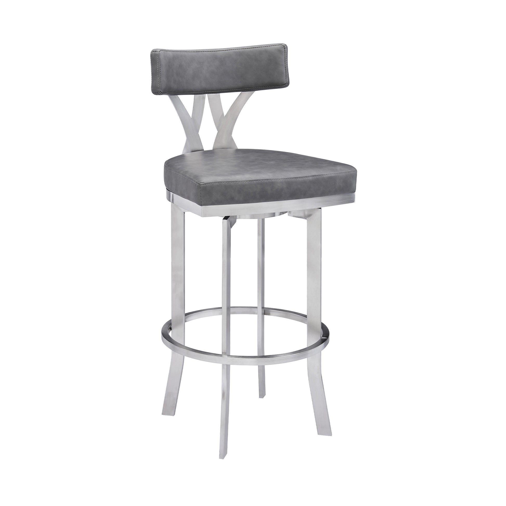 Incorporate a standout piece of furniture that provides as much style as it does function with the Natalie 26" Counter Height Vintage Grey Faux Leather Upholstery and Brushed Stainless Steel Bar Stool from Armen Living. The chic metal frame features strong flared legs and a convenient ring footrest that are further accented by the unique cross back design. The high-density foam cushion is wrapped in luxurious faux leather upholstery that keeps you comfortably seated and makes clean up a breeze. The high back of the Natalie kitchen stool features excellent lumbar support and ergonomic properties to keep your back healthy and properly aligned. The armless design allows you to pull the Natalie up to any kitchen island, peninsula counter, or home bar. The Natalie bar or counter stool can easily fit into your existing home décor as it’s available in your choice of a brushed stainless steel with vintage grey faux leather upholstery or a black metal finish with vintage grey faux leather upholstery.