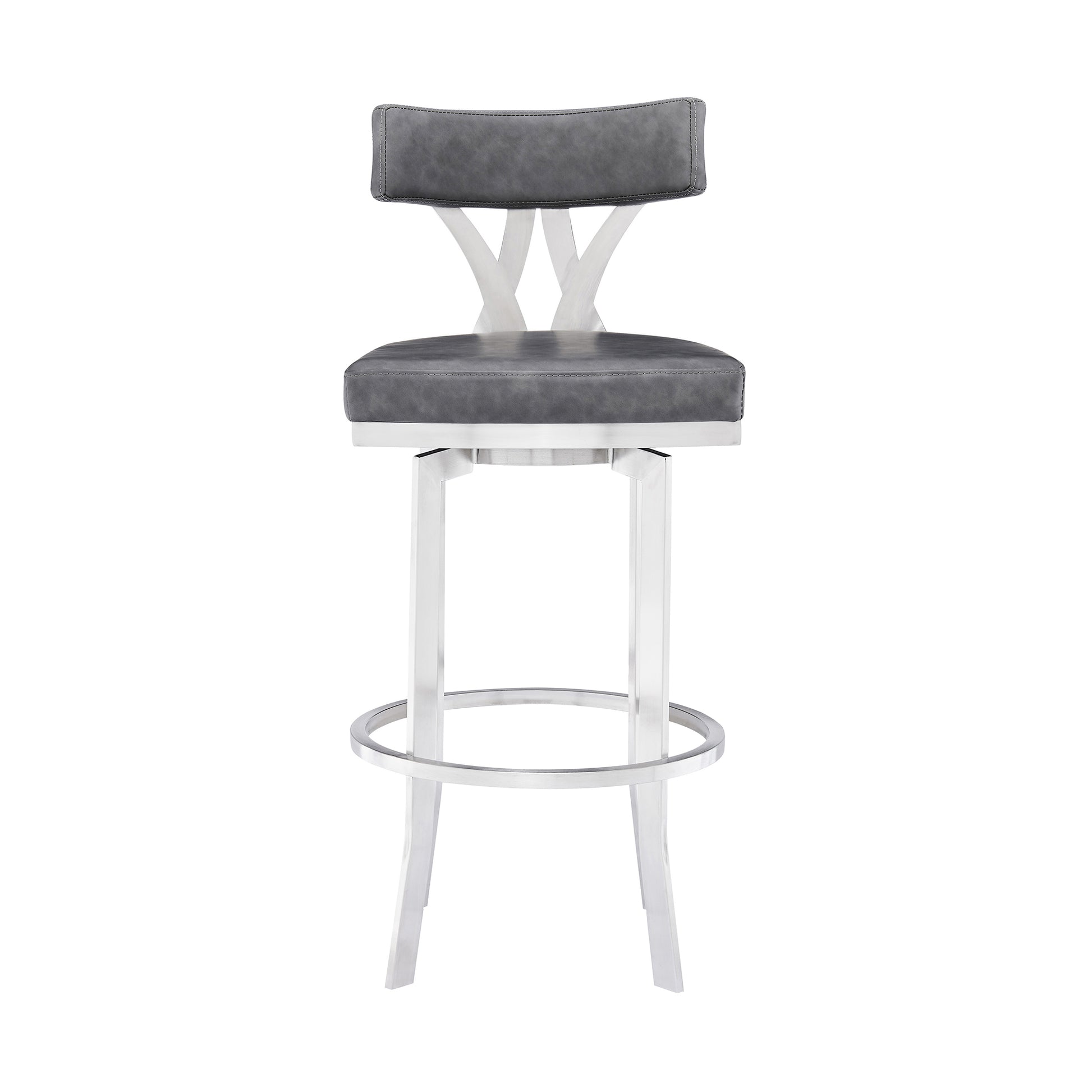 Incorporate a standout piece of furniture that provides as much style as it does function with the Natalie 30" Bar Height Vintage Grey Faux Leather Upholstery and Brushed Stainless Steel Bar Stool from Armen Living. The chic metal frame features strong flared legs and a convenient ring footrest that are further accented by the unique cross back design. The high-density foam cushion is wrapped in luxurious faux leather upholstery that keeps you comfortably seated and makes clean up a breeze. The high back of the Natalie kitchen stool features excellent lumbar support and ergonomic properties to keep your back healthy and properly aligned. The armless design allows you to pull the Natalie up to any kitchen island, peninsula counter, or home bar. The Natalie bar or counter stool can easily fit into your existing home décor as it’s available in your choice of a brushed stainless steel with vintage grey faux leather upholstery or a black metal finish with vintage grey faux leather upholstery.