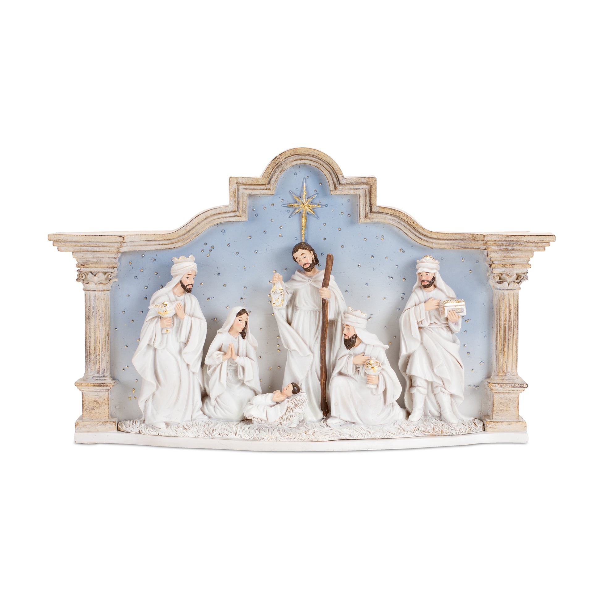 Add a heavenly touch to your Christmas decor with this beautiful Holy Family statue. Featuring Joseph, Mary, Baby Jesus, and the three wisemen, this nativity scene is the perfect addition to your religious holiday decor. The faux wooden design paired with the white-washed finish is the perfect combination to create a stunning Christmas display. The quality polyresin composition is sure to last for seasons to come.