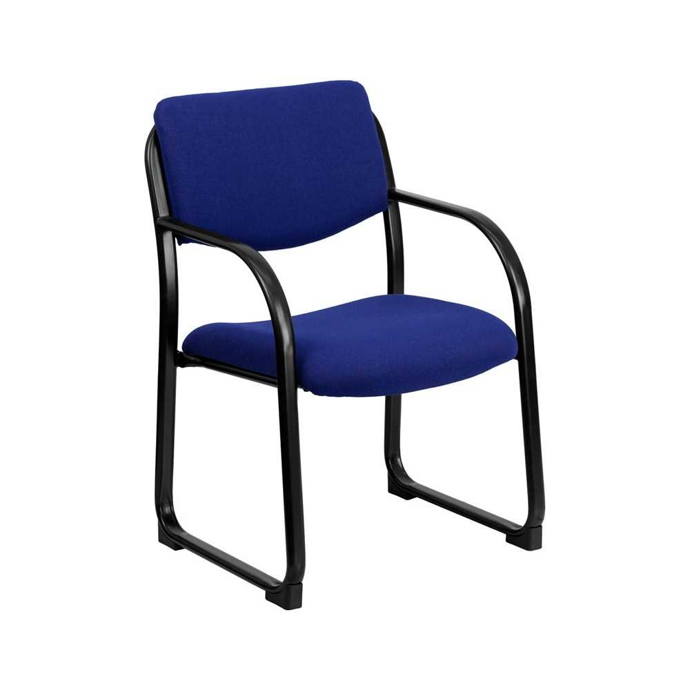 Add refined style to your reception waiting room or inner office with this blue, fabric upholstered executive side reception chair. Featuring contoured cushions and curved arms to relieve stress on the neck and shoulders, this chair will provide supreme comfort for clients and guests. The stabilizing sled base is a great choice on carpeted floors because the legs won't snag. The open back design paired with the sled base frame in a black powder coated frame finish give this side chair an elegant, understated quality that will be noticed. [BT-508-NVY-GG]
