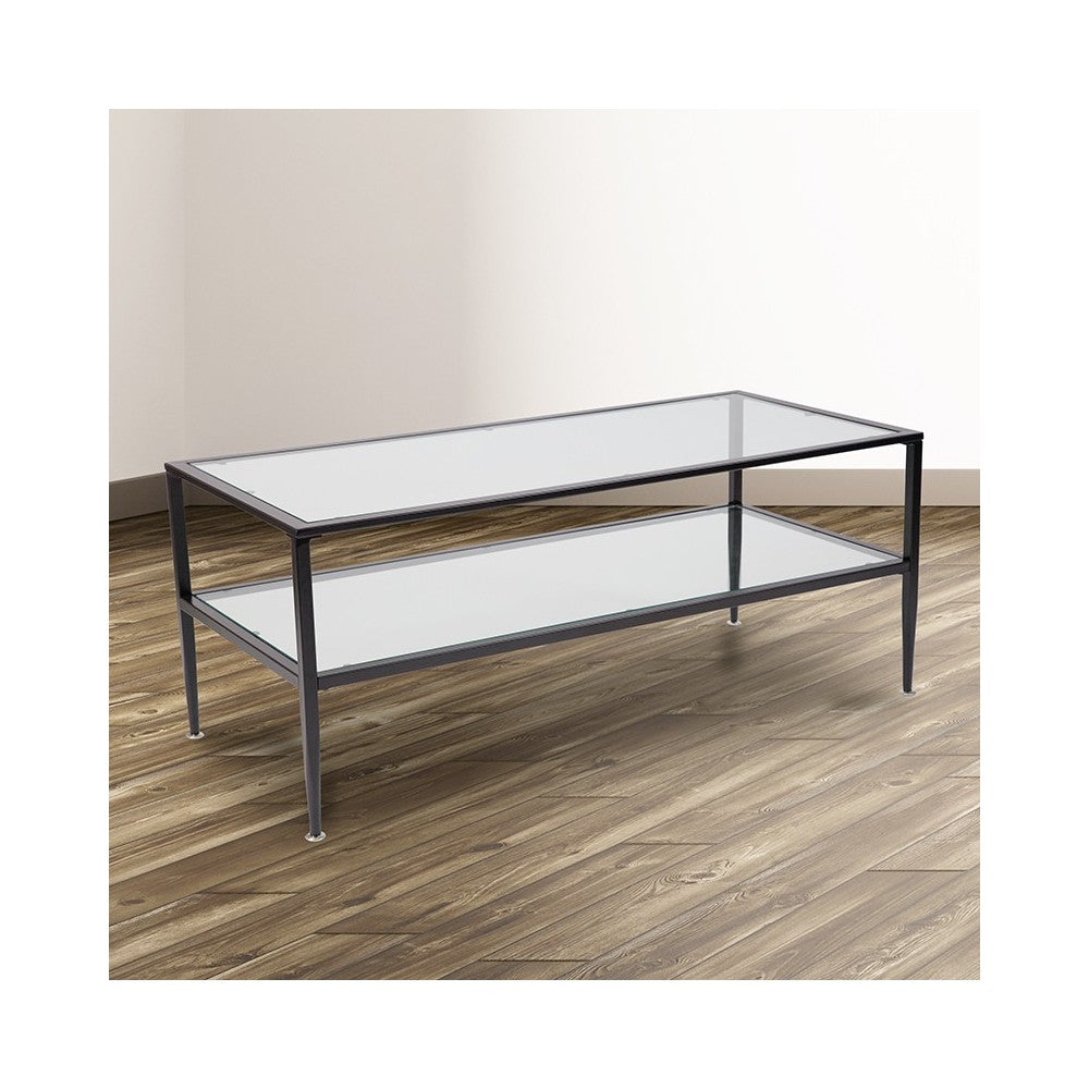 Bring modern style to your seating arrangement with this coffee table, a perfect pick for contemporary spaces. This attractive table offers a clean minimalist feel that will blend seamlessly and look great in any room. Its frame is crafted from metal in a versatile dark finish and features a lower open shelf to bring an extra bit of storage space to your arrangement, while the tempered glass top acts as the perfect perch for TV remotes, magazines, and more. Metal frame borders create a striking contrast against the tempered glass shelves. Glass tabletop gives the illusion of space for an open airy feel making this table perfect for smaller homes. The tapered legs feature adjustable floor glides to keep the table level on uneven floors. [HG-160333-GG]