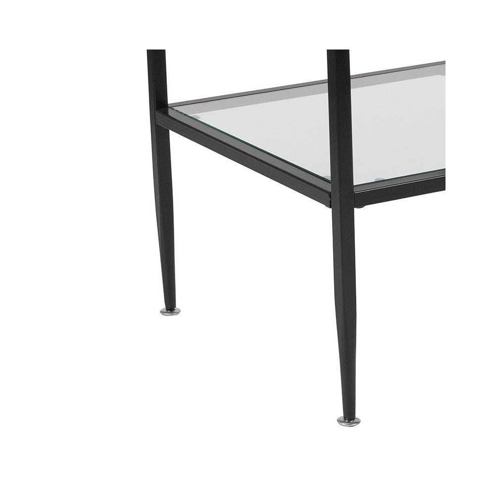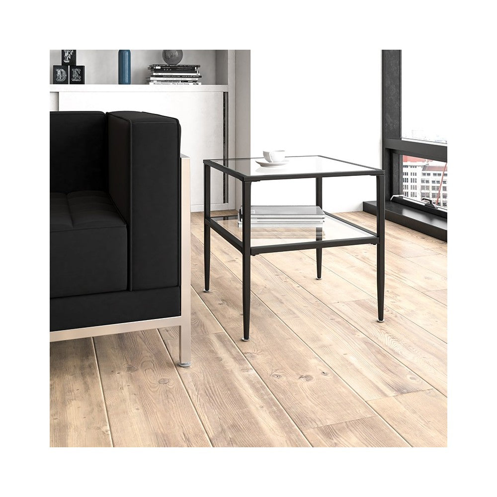 If your living space is feeling a little empty, an end table could be just what you need. This attractively styled table will give you the surface space you need for plates and cups while entertaining, displaying family photos or those treasures you've accumulated over the years while the clear glass adds an open airy feel. The metal frame borders the glass while the tapered legs feature adjustable floor glides to keep the table level on uneven floors. [HG-160913-GG]