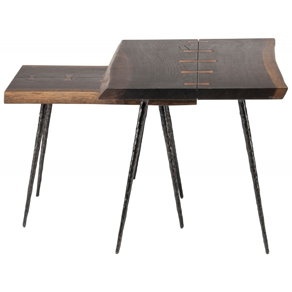 The bronze sculptures of the Giacometti brothers inspire the Nexa side table featuring textured legs, sculpted by hand, buffed and blackened in cast iron. The table top is defined by handcrafted live edge seared oak with dovetail detailing in contrasting wood. The grain of each table is unique using carefully sourced solid French white oak.