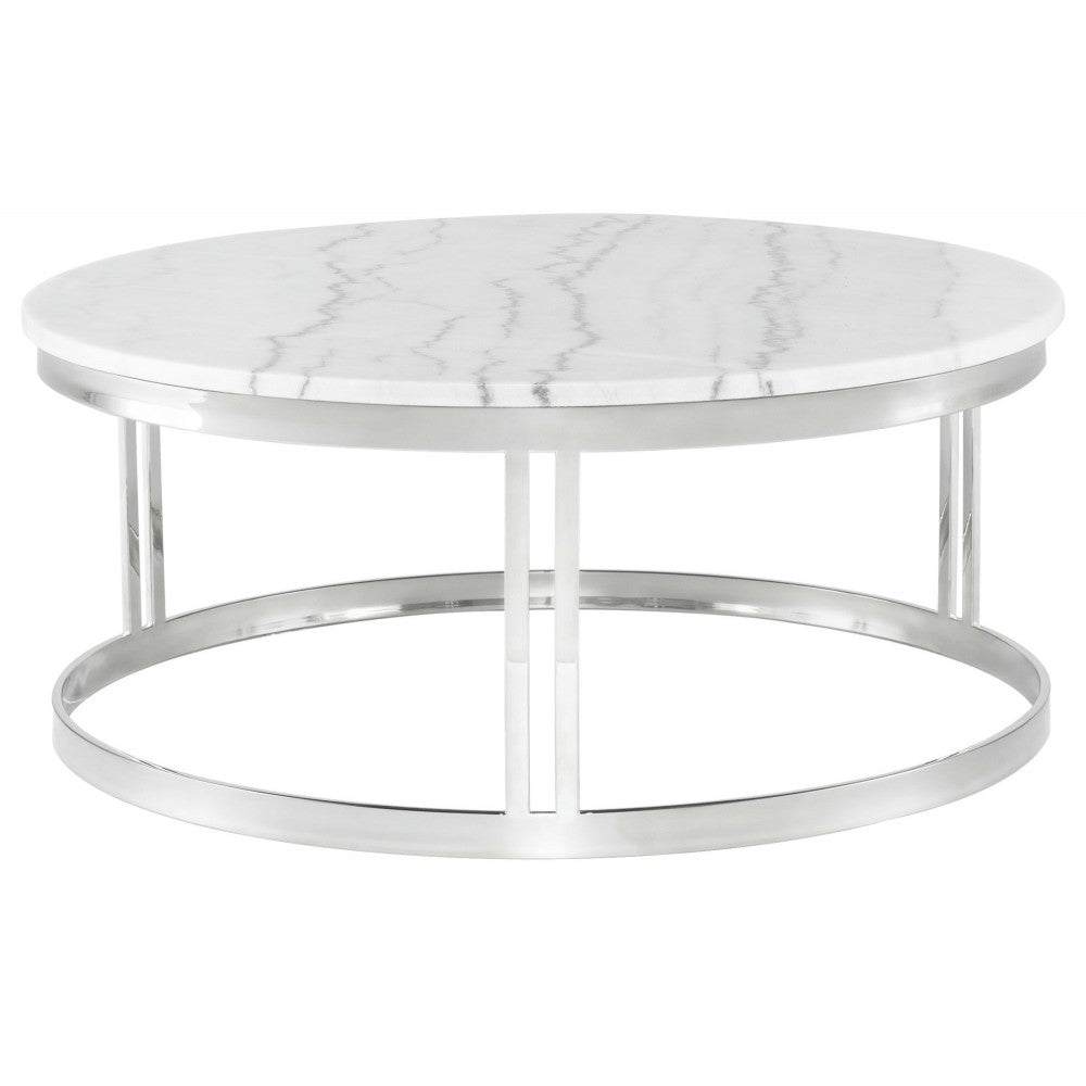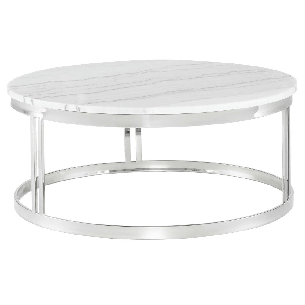 The Nicola coffee table finds balance and symmetry in the repetition of the round. A perfect circle of marble rests atop two elegant circumferences of stainless steel with doubled steel supports. The Nicola's minimalist design is striking for its simple formal elegance. Each piece of marble is expertly crafted out of a unique piece of natural stone, creating beautiful variations and one-of-a-kind details.