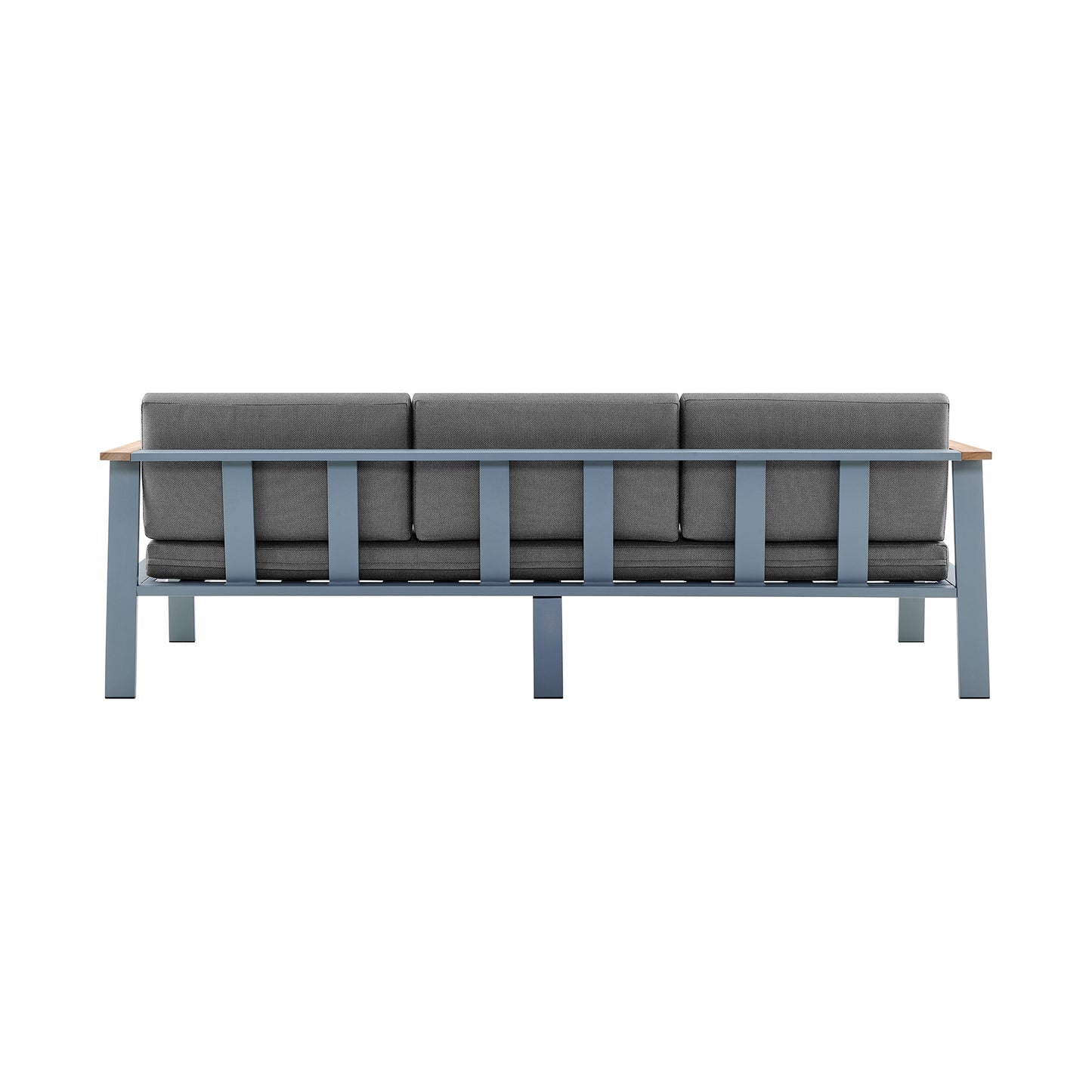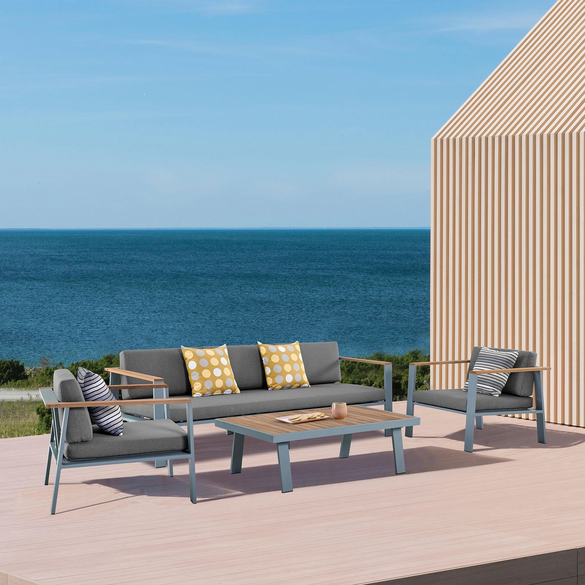 The Armen Living Nofi contemporary 4 piece patio set is an elegant ensemble of items that is certain to enhance the beauty of any modern outdoor seating arrangement. Featuring 2 arm chairs, 1 three-seater sofa, and 1 coffee table, the Nofi is an ideal arrangement for comfort and aesthetic balance. The beautiful Nofi coffee table features an aluminum frame complemented brilliantly by a sturdy teak wood top. The same teak wood is used to accent the arms of the sofa and arm chairs to enhance aesthetic cohesion. The olefin upholstered arm chair and sofa cushions feature foam padding and are water, chemical, and fade resistant. The Nofi set also comes with 4 throw pillows for added comfort and support.