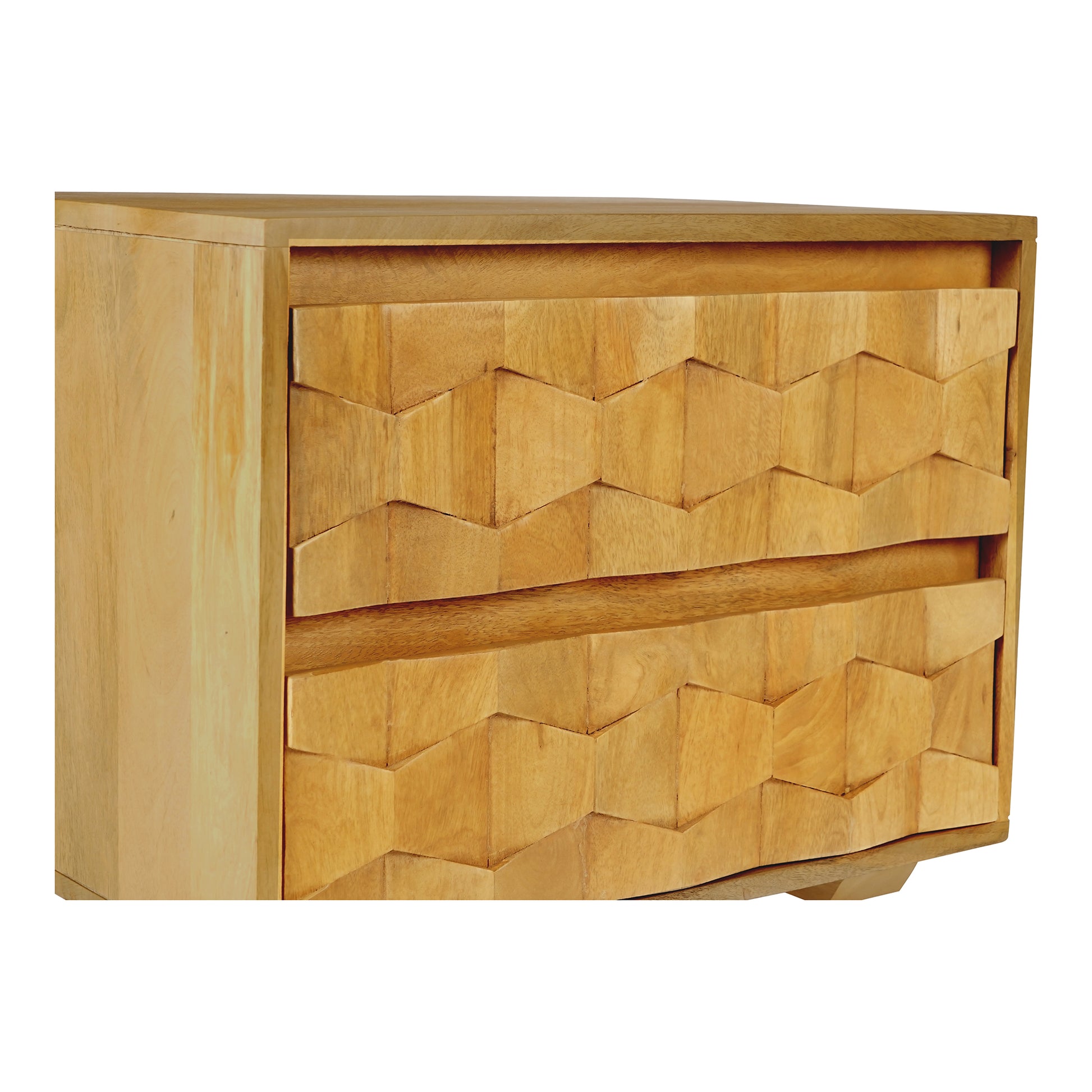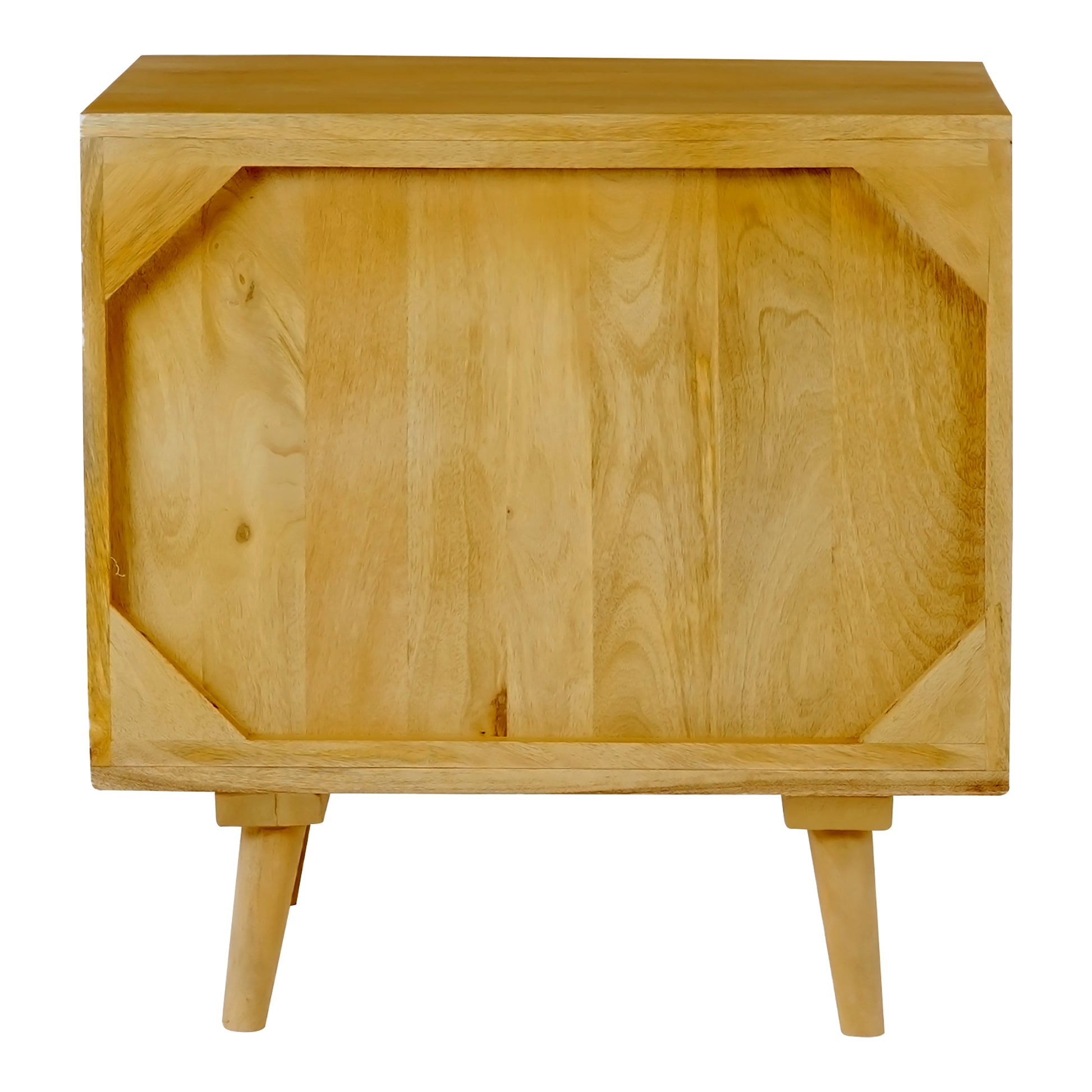 The O2 two drawer nightstand is a retro-inspired with a modern twist. Constructed with solid mango wood, this piece is resistant to major wear and tear. Its warm tone and intricate drawer detailing provide character and ample storage to your bedroom space.