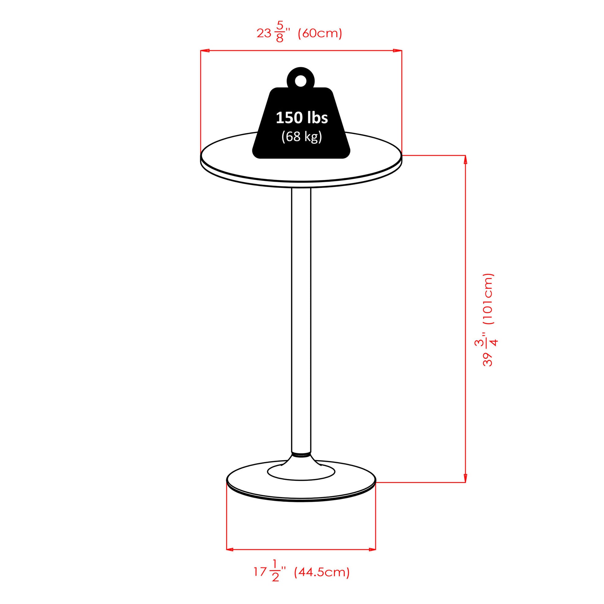 - Round Table Top with MDF veneer in Black has surface area of 23.6" Round and stands at 39.75" High.