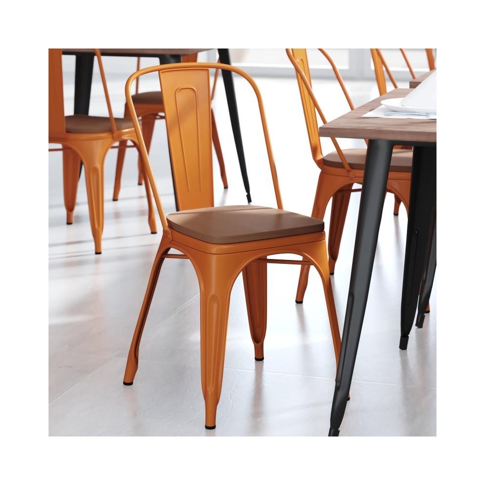 Refresh the look of your commercial or residential spaces with this colorful dining chair featuring an all-weather polystyrene seat that won't rot, chip, or peel. Appealing in both modern and industrial spaces, this bistro style chair will completely transform your indoor or outdoor entertaining spaces. Designed for commercial environments the steel frame is coated in a durable powder coat finish to endure in high traffic hospitality areas as well as your home. With a 500 pound static weight capacity you'll be able to accommodate all visitors for as long as you're open for business. The stack chair, available in multiple colors, arrives fully assembled for your convenience and the poly resin seat attaches to your chair in minutes. These chairs wipe clean with water and a neutral detergent. For longevity, care should be taken to protect chair frame from long periods of wet weather. [CH-31230-OR-PL1T-GG]