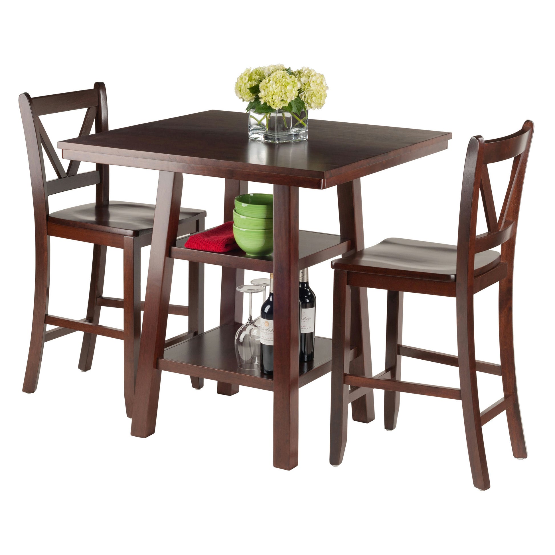 The 3-piece Orlando High Table and V-Back Stool Set combines simplicity and function, reminiscent of a country home antique. The set is a great addition to a dining area, eat-in kitchen, or family room for cards and board games. Or pull up one of the stools and use the table as a desk or workspace. The table features 2 shelves that offer generous storage space for dishes, glassware, and other dining accessories. The solid wood V-Back Stools add a splash of style to the set's warm and homey character. Finished in a rich Walnut, the table is made of solid and composite wood for long-lasting stability. Overall table size is 33.8"W x 33.8"D x 36"H.