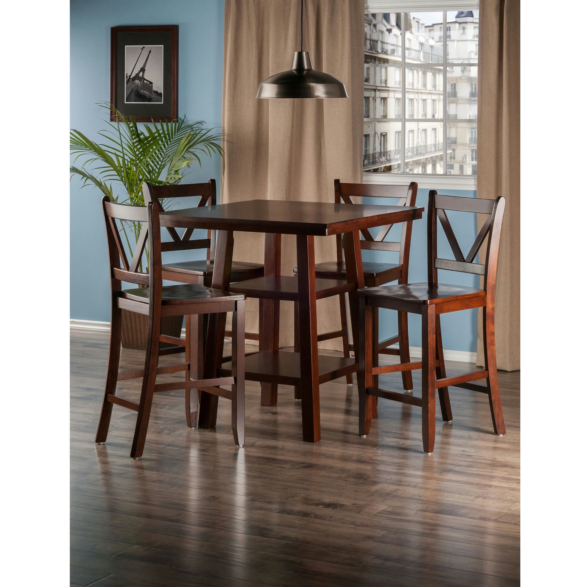 The 5-piece Orlando High Table and V-Back Stool Set combines simplicity and function, reminiscent of a country home antique. The set is a great addition to a dining area, eat-in kitchen, or family room for cards and board games. Or pull up one of the stools and use the table as a desk or workspace. The table features 2 shelves that offer generous storage space for dishes, glassware, and other dining accessories. The solid wood V-Back Stools add a splash of style to the set's warm and homey character. Finished in a rich Walnut, the table is made of solid and composite wood for long-lasting stability. Overall table size is 33.8"W x 33.8"D x 36"H.
