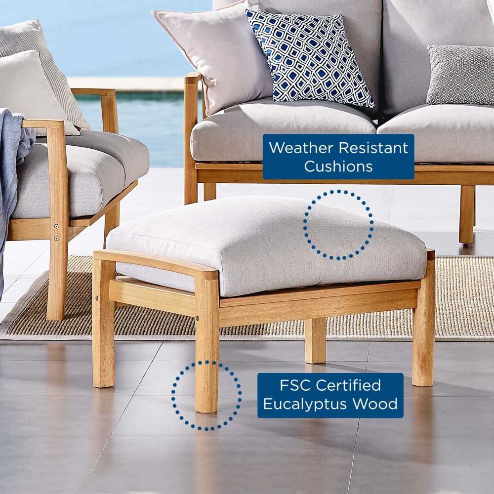 A versatile update to your patio decor, Orlean is a stylish ottoman designed to enhance any outdoor furniture assortment. Made of FSC certified eucalyptus wood, Orlean features a slatted seating surface and generously padded all-weather cushion. This extra seating surface or footrest provides exceptional comfort and is a welcome addition to the backyard, deck, or patio. Ottoman Weight Capacity: 331 lbs.