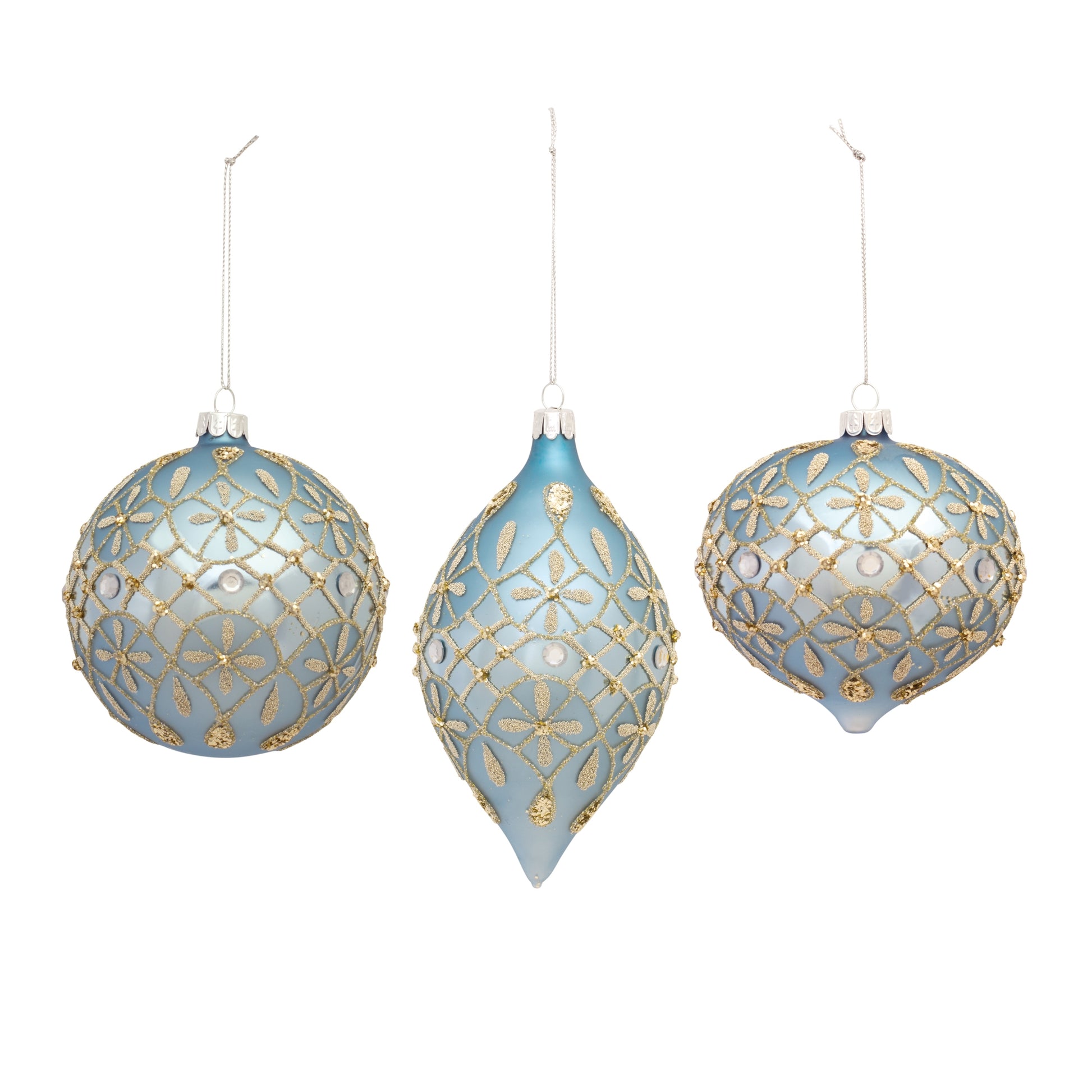 Adorn your Christmas Tree with this beautiful set of Ball Ornaments. Featuring three assorted designs, the classic ball and onion ornament design paired with the cool blue finish with ornate patterned accents makes this set the perfect addition to your holiday tree decor. The pieces can be used as gifts for friends to cherish, or you can display the set on your own Christmas tree and enjoy them for years to come.