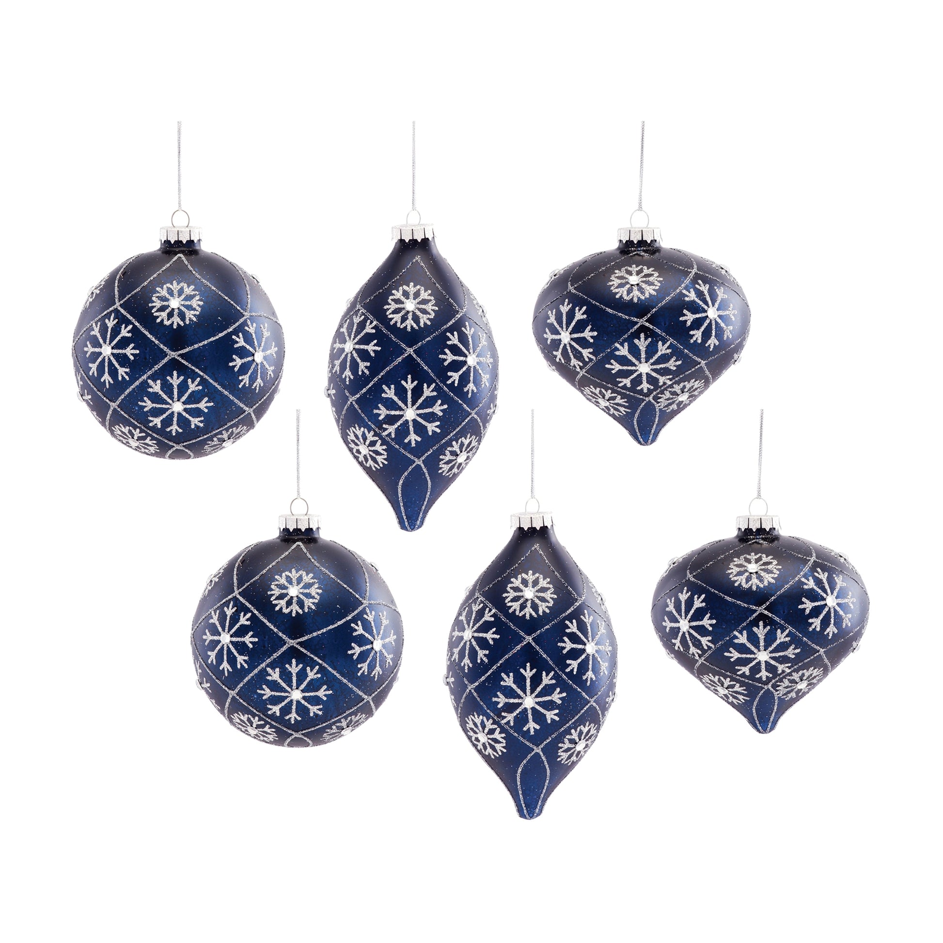Adorn your Christmas Tree with this beautiful set of Glass Ornaments. Featuring three assorted designs and six total pieces, the cool navy finish paired with the chic silver snowflake accent makes this piece the perfect addition to your holiday tree decor. They can be used as Christmas gifts for friends to cherish, or you can display the set on your own tree and enjoy them for years to come.