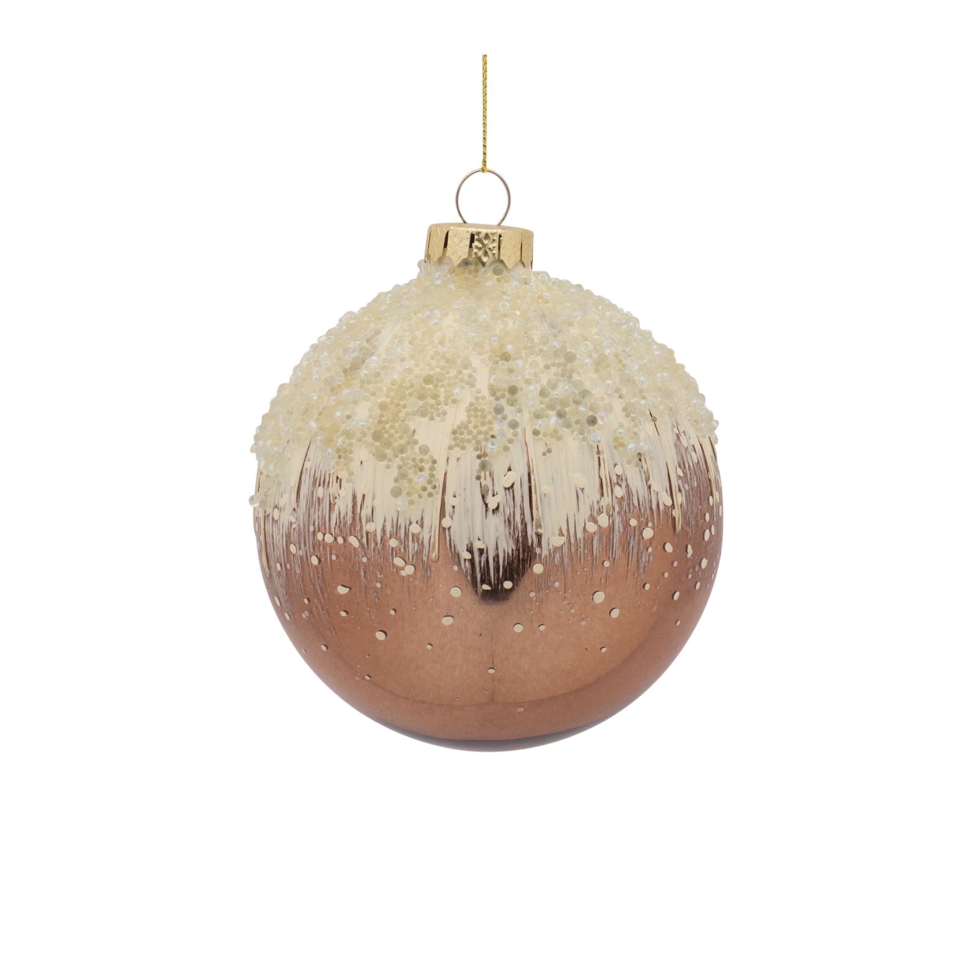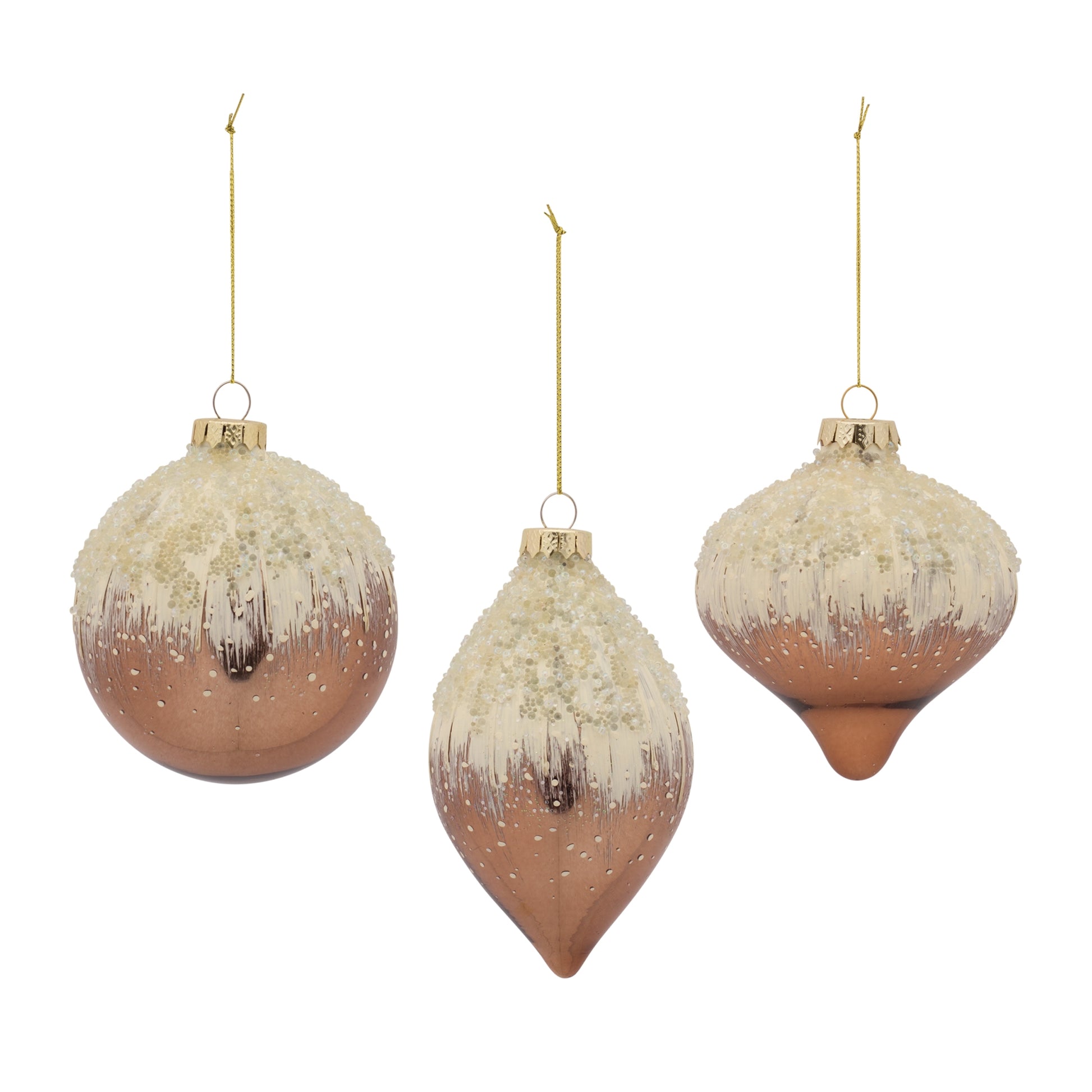 Adorn your Christmas Tree with this beautiful set of Ball Ornaments. Featuring three assorted designs, the classic ball and onion ornament design paired with the chic bronze and white finish with "snowy" accent makes this set the perfect addition to your holiday tree decor. The pieces can be used as gifts for friends to cherish, or you can display the set on your own Christmas tree and enjoy them for years to come.