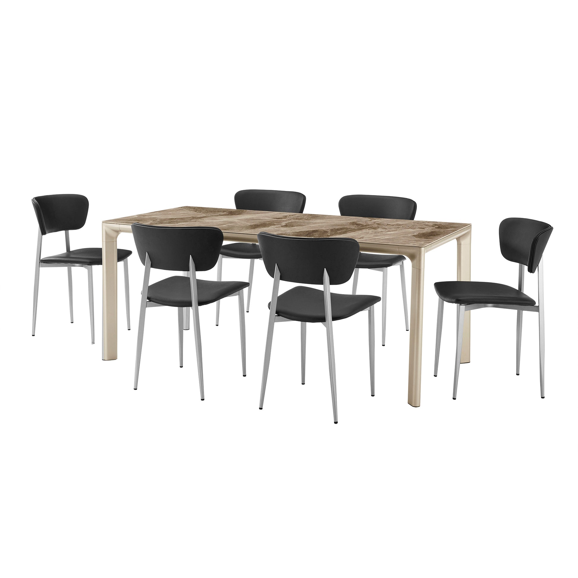 Gather your loved ones for a wonderful meal or conversation and seat them in the Otello and Tori 7 PieceDining Set from Armen Living. This wonderful dining chair is crafted to be breathable, with its open back, giving you a pleasant experience. The MATERIAL covers the entire chair back and seat, giving you the look and the feel you have always been looking for. The champagne silver legs and accents are visually stunning but also crafted to be durable sturdy, doing all the work for you by maintaining themselves for many years to come. The Otello Dining Table from Armen Living is a contemporary dining table that adds a touch of pure sophistication to a kitchen, bar or lounge area, or even a breakfast nook. It features a strong and striking stainless steel 4-legged base, giving it sleek and stunning visual appeal. The rectangular ceramic top completes the elegant look, while also contributing to the durability of this piece - not only easy to clean but will last years for you and your home! Modern in style, this table is perfect for relaxing with a glass of wine after work or enjoying entertaining a large group of guests.