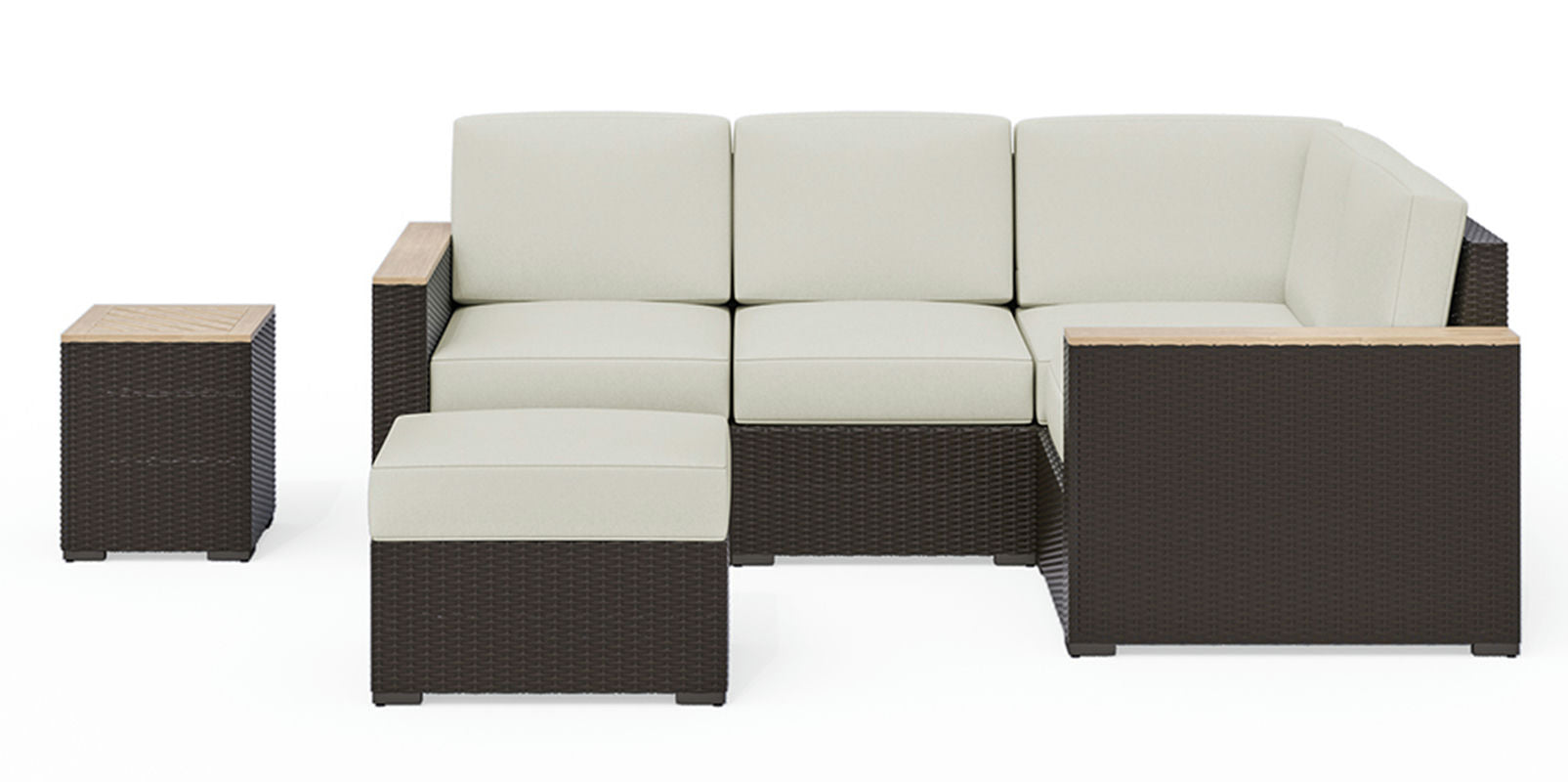 Instantly transform any size patio, balcony or deck area into an inviting, comfortable haven with this Palm Springs collection four-seat sectional, ottoman, and table. Built for indoor or outdoor use, every element is built to withstand the elements, from the weather-resistant rattan to the fade-free cushion fabric. Cozy cushions deliver lasting comfort and the covers easily unzip to clean. An ottoman with cushioned top is a great place for your feet or for another short-term seating spot. Easily bring the sectional elements into a tight configuration, or change your mind and quickly reconfigure. The Acacia table top is naturally resistant to water and fading, keeping it looking great season after season. Combine other Palm Springs collection items to complete your vision for the great outdoors.