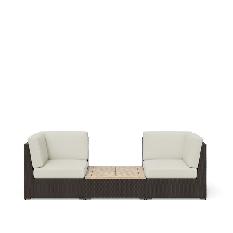 Turn even a small corner into your new favorite spot with this Homestyles Palm Springs 3-Piece Outdoor Set. Two side chairs bring the comfort of a living room into any environment, indoor or outdoor. The coffee table features a water-resistant Acacia wood top with two removable areas that reveal hidden plastic storage bins. The weather-resistant cushions and all-weather rattan deliver solid performance year after year.