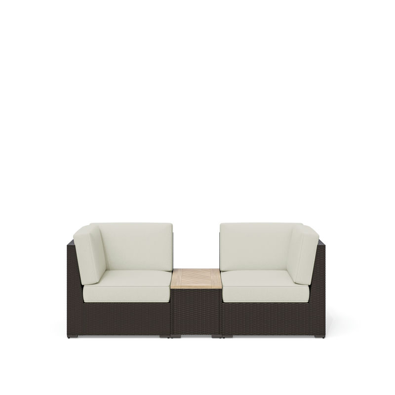 Turn even a small corner into your new favorite spot with this Homestyles Palm Springs 3-Piece Outdoor Set. Two side chairs bring the comfort of a living room into any environment, indoor or outdoor. The storage table features a water-resistant Acacia wood top with a removable section for hidden storage. The chairs and storage table can all be securely joined together with frame clips for a solid, stable foundation. The weather-resistant cushions and all-weather rattan deliver solid performance year after year.