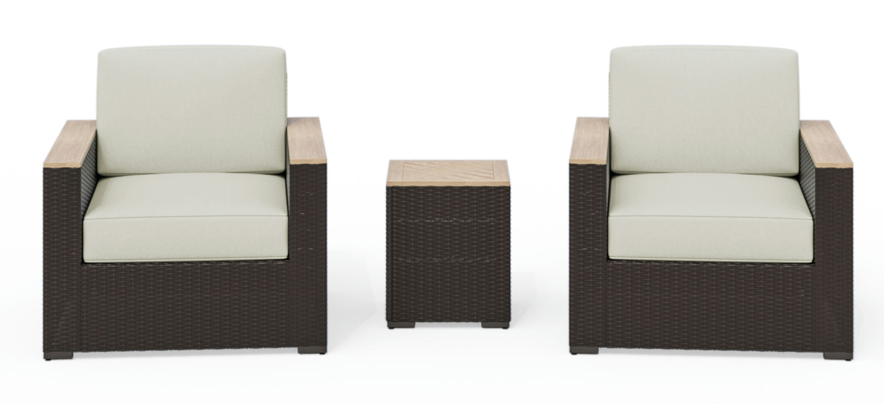 Instantly transform any size patio, balcony or deck area into an inviting, comfortable haven with this Palm Springs set consisting of two chairs and a table. Perfect for indoor or outdoor use, each piece is built to withstand the elements, from the weather-resistant rattan to the fade-free cushion fabric. Cozy cushions deliver lasting comfort and the covers easily unzip to clean. Solid acacia wood arms combine style and durability to keep your outdoor refuge looking sharp season after season. The Acacia table top is naturally resistant to water and fading, keeping it looking great season after season. Combine other Palm Springs collection items to complete your vision for the great outdoors.