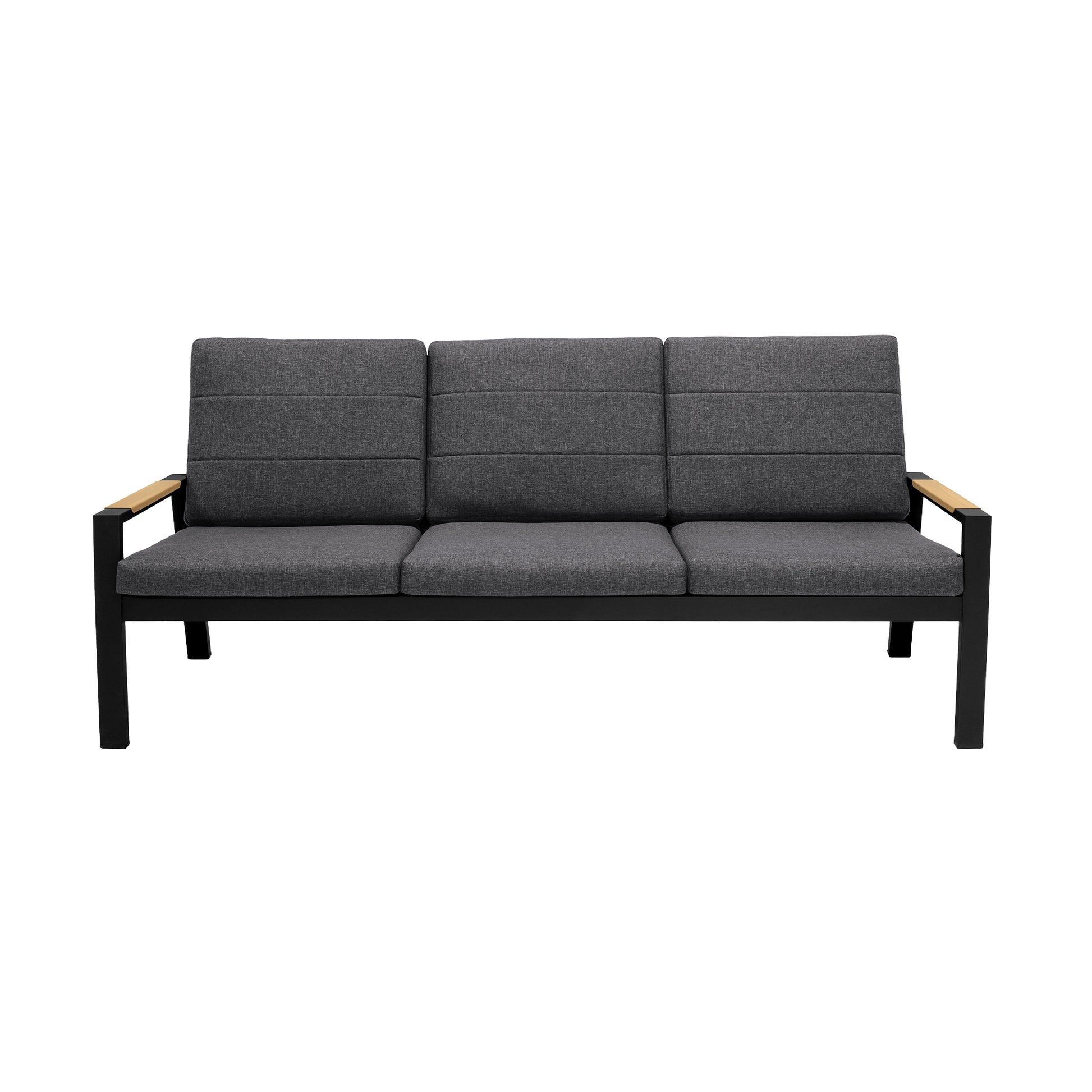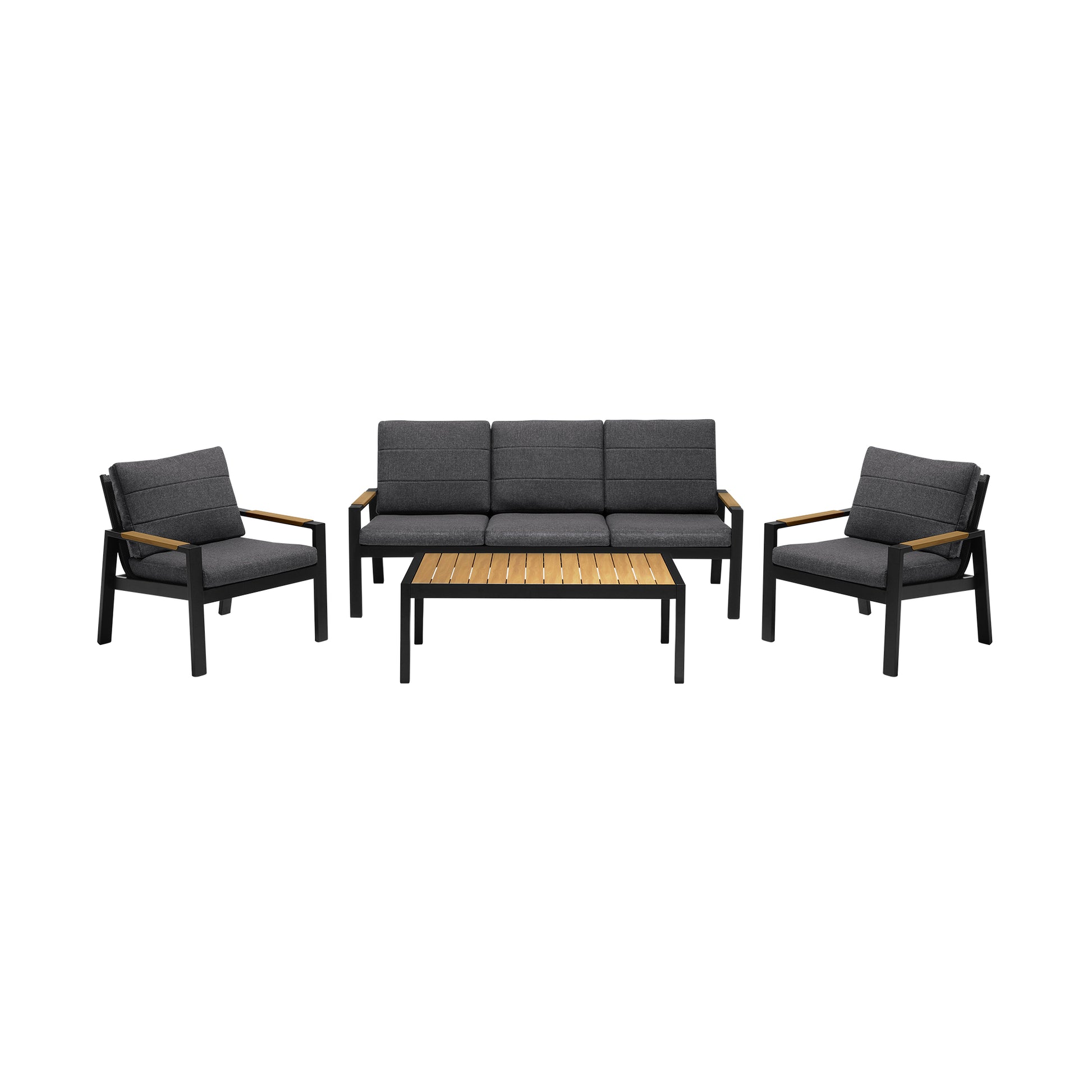 The Panama Outdoor 4 Piece Black Aluminum Sofa Seating Set with Dark Grey Olefin from Armen Living is the perfect outdoor set to introduce to your outdoor living area. This set offers so much more space to seat guests in your outdoor patio area. The exceptionally plush foam-padded seat back and seat cushion on the chairs and sofa will keep you seated for hours - they are beyond comfortable and give you the proper support! Aside from its comfortable and inviting feel, the Olefin upholstery offers high levels of durability due to its fibers containing less moisture, which allows it to dry much quicker than other outdoor textiles. The durable aluminum frame is lightweight, but durable and dependable against the outdoor elements. The olefin fabric of the cushions is abrasion, stain, sunlight, fire, and chemical resistant - perfect for leaving outdoors for extended periods of time! The unique arm accents and tabletop mimic wood but are a unique finish on the aluminum that gives off a warm and natural finish and lifts the design and details of the sofa but are easy to clean and naturally environmentally friendly as well as weather resistant. The convenient zipper closure on the cushions allows for easy removal for cleaning. The Panama Outdoor 4 Piece Black Aluminum Sofa Seating Set comes complete with 1 Panama Outdoor Black Aluminum Sofa with Dark Grey Olefin, 2 Panama Outdoor Black Aluminum Lounge Chairs with Dark Grey Olefin, and 1 Panama Outdoor Black Aluminum Rectangular Coffee Table. Sofa Dimensions: W:79 x D:33 x H:31 x SH:18. Coffee Table Dimensions: W:47 x D:25 x H:17. Lounge Chair Dimensions: W:32 x D:29 x H:30 x SH:18.